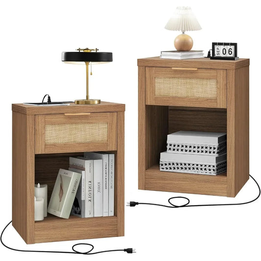 - Rattan Nightstand End Table with Charging Station and 2 Drawers Storage