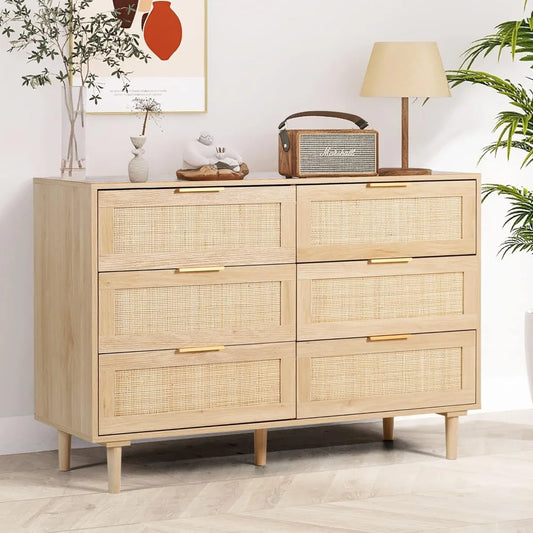 - Rattan Dresser Bedroom Storage 6 Drawer Modern Chest with Gold Handles