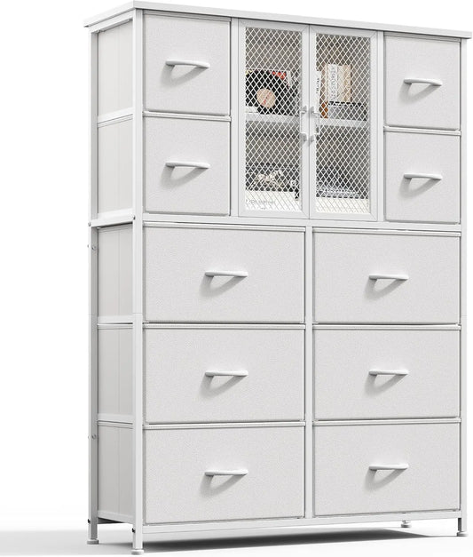 White Dresser Bedroom Organizer Tall Chest with 10 Fabric Drawers