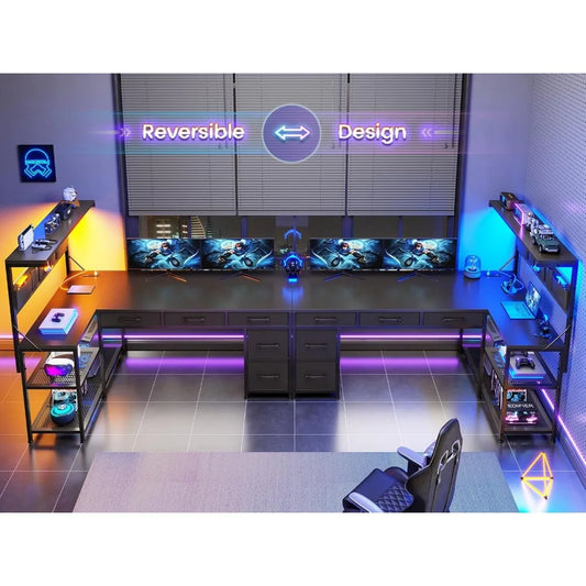 L Shaped Gaming Desk with Storage Drawers and Shelves for Home Office