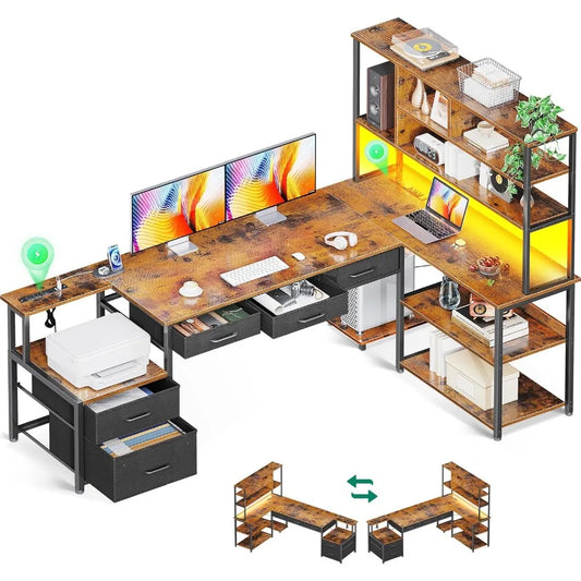 L Shaped Desk with File Drawers Gaming Desk with Power Outlets LED Lights
