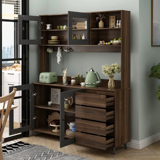 - Large Kitchen Hutch Cabinet with Glass Doors and Drawers for Storage