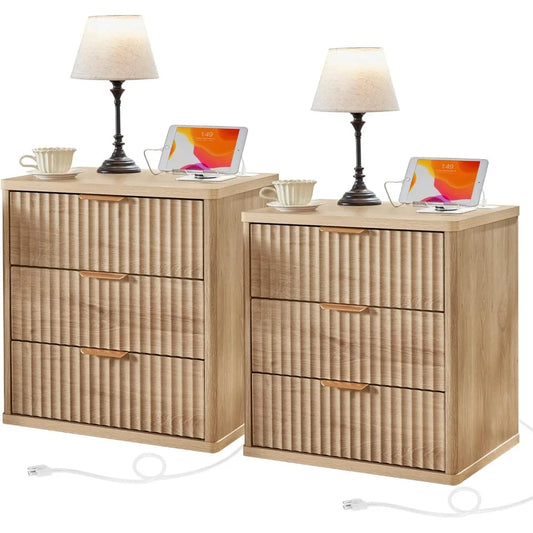 23 Inch Wide Fluted Night Stand Set of 2 with Charging Station and Drawers