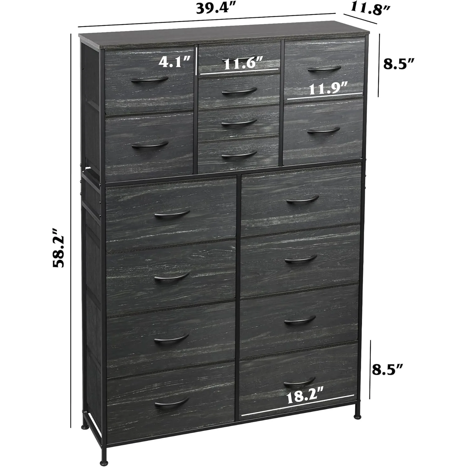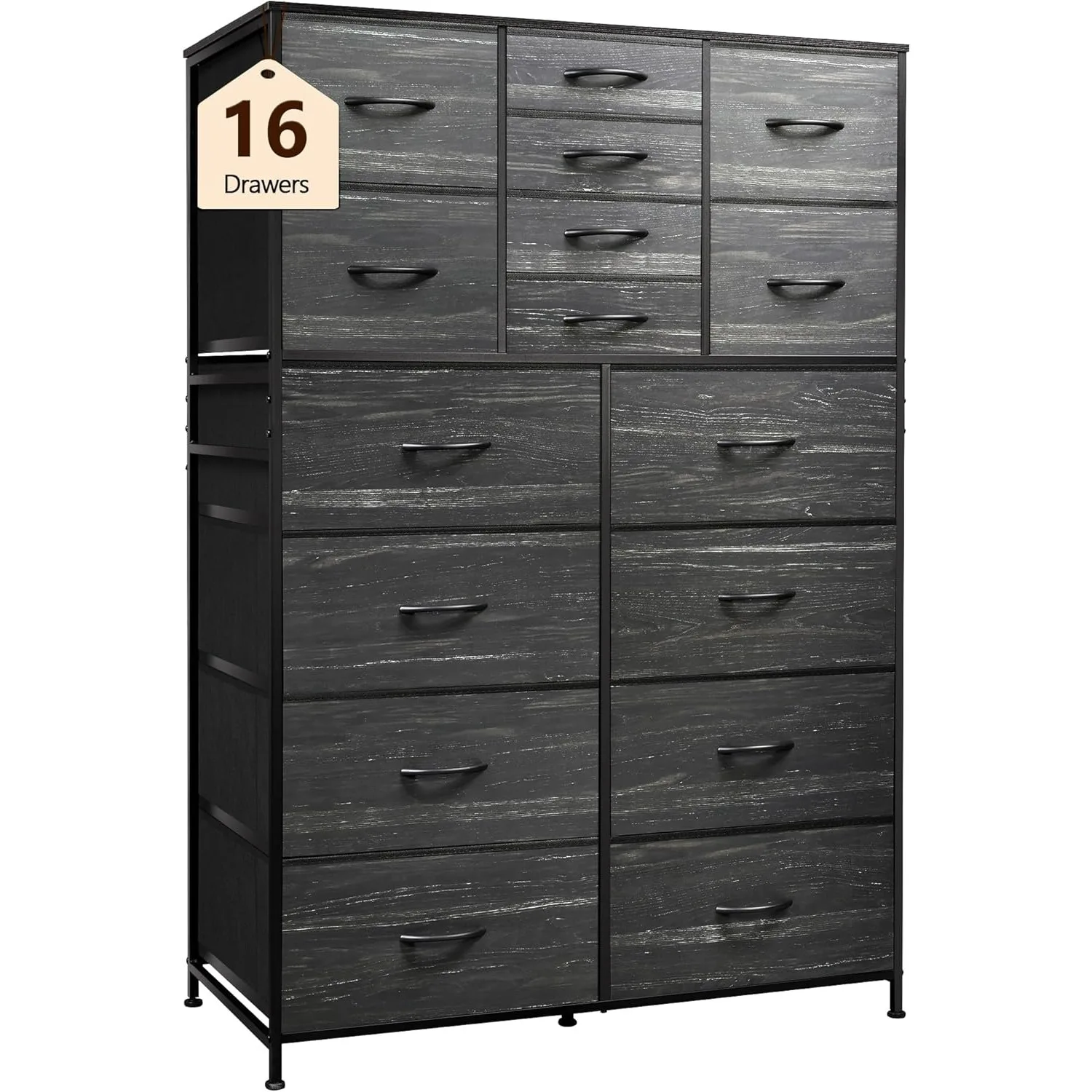 16 Drawers Dresser, Tall Dresser for Bedroom, Closet, Hallway, Storage Dresser Organizer Unit, Charcoal Black Wood Grain Print