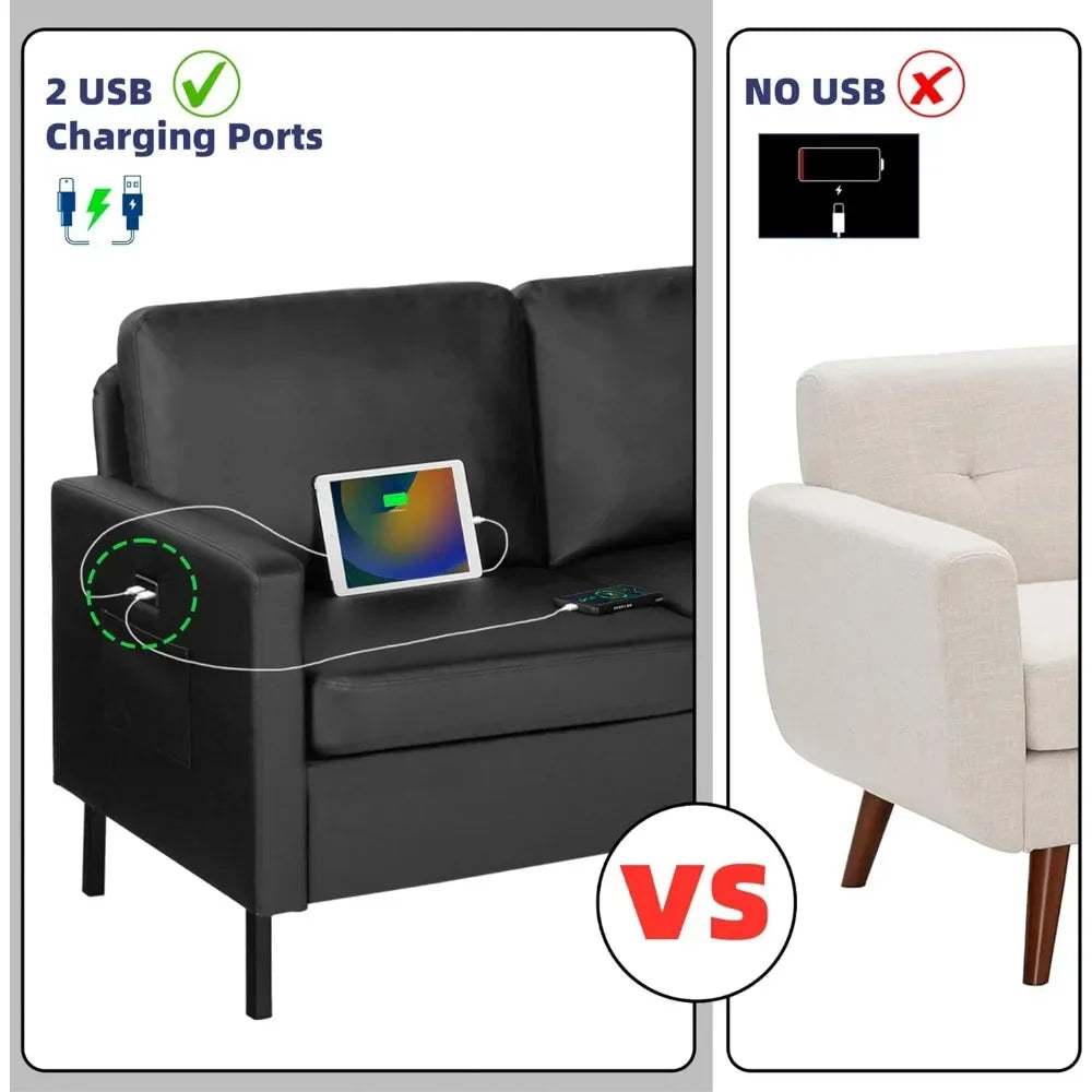 72" Faux Leather Sofa Couch with USB Ports & Storage for Living Room