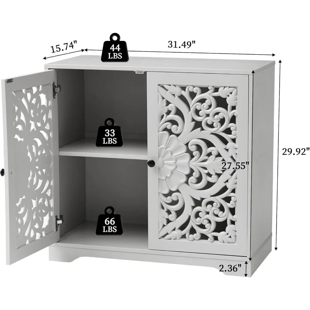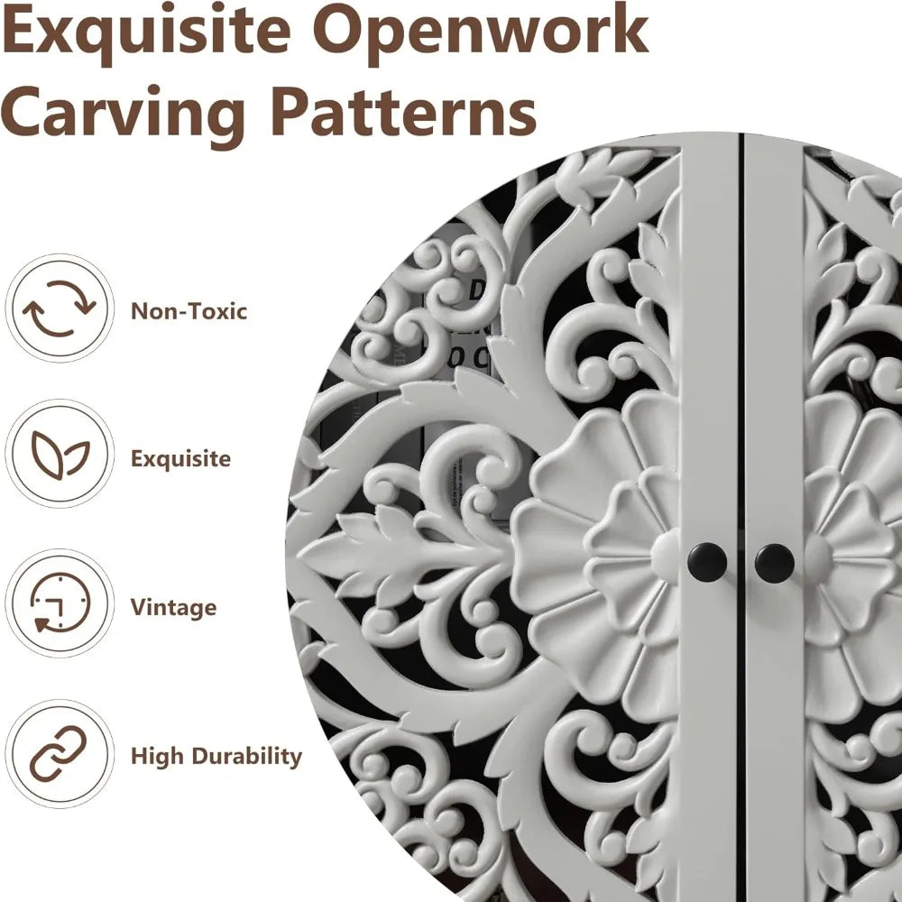 - Spacious Storage: Comes with adjustable shelves behind elegantly carved doors for customized organization.