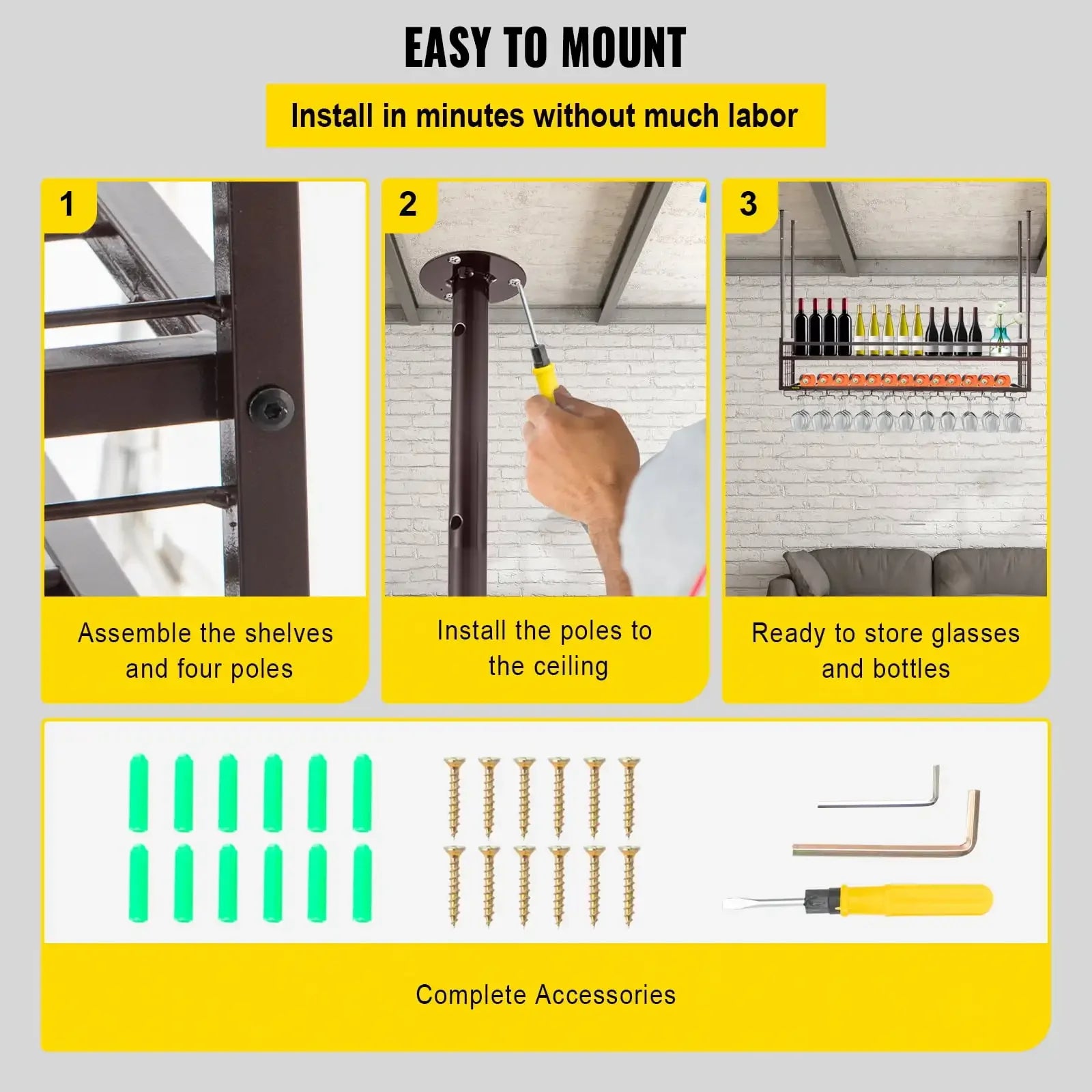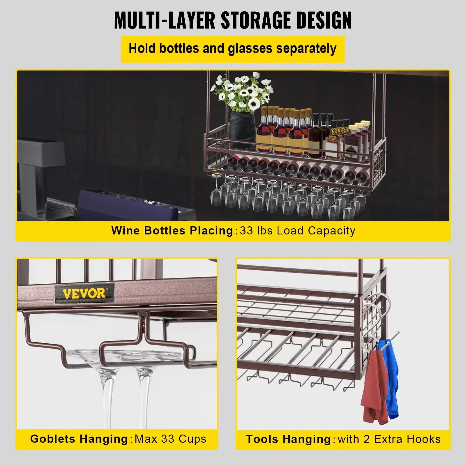 - Two-in-One Heavy Duty Rack: Measuring 46.9 x 11.8 inches, this multifunctional rack can store wine bottles while holding up to 33 glasses, with a weight capacity of 33 pounds. Plus, two extra hooks are included for hanging tools like cleaning cloths or bottle openers.
