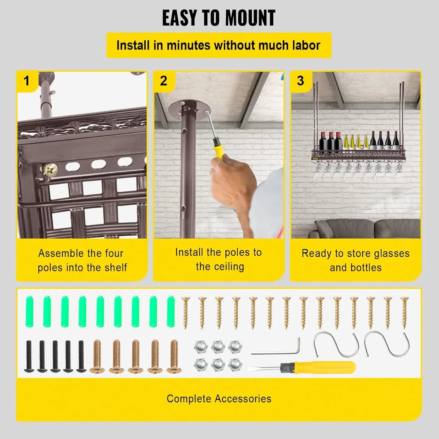 - Easy Installation: Save time with a simple assembly process that allows you to have your wine rack ready in no time. Just tighten screws and mount it to the ceiling.