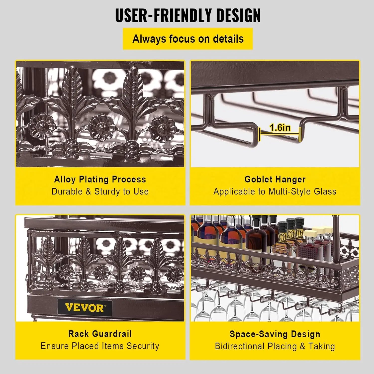 - Durable and Stylish: Crafted with an alloy plating process, this rack is rust-proof and sturdy, designed to support various types of glasses with bases larger than 1.6 inches.