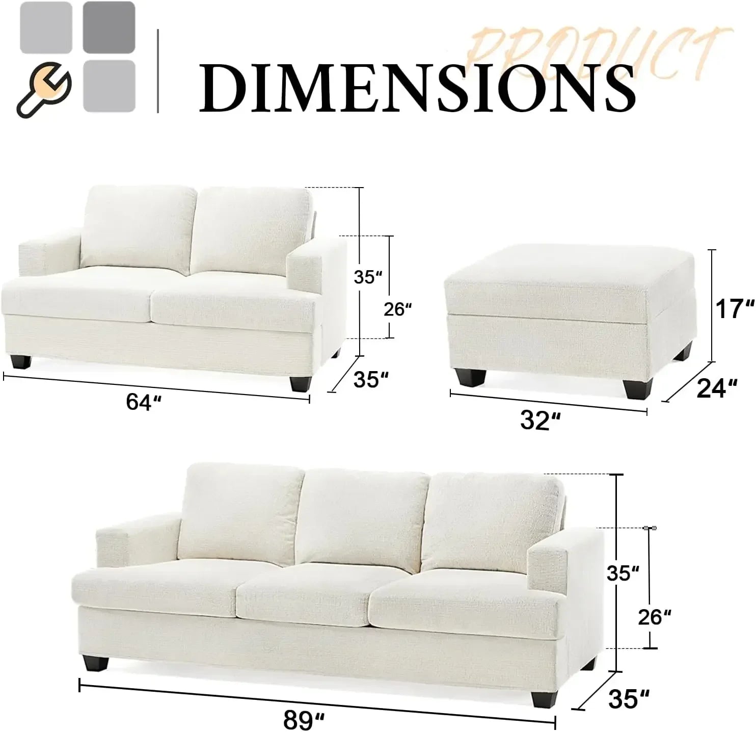 Chenille Beige Sofa Set w/ Storage Ottoman – 3-Seater & Loveseat, Comfy Couch for Living Room
