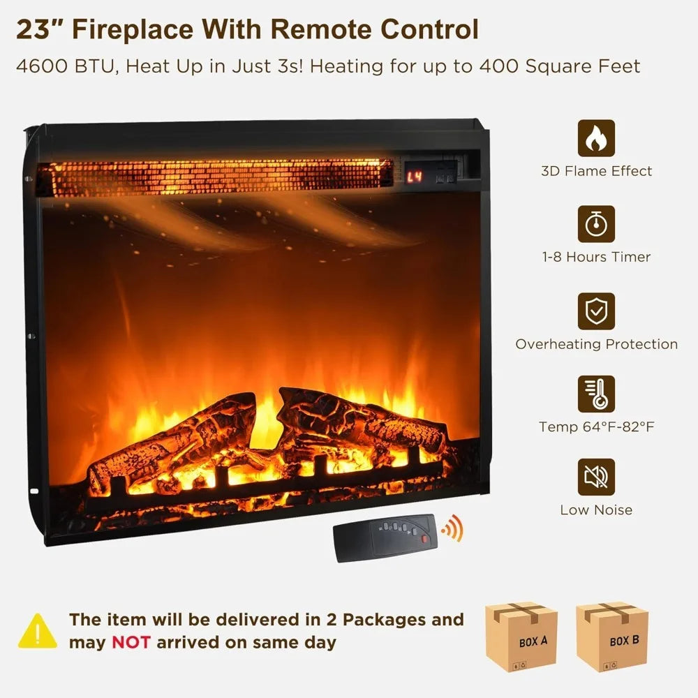 - 23" Electric Fireplace with Remote Control: Enjoy realistic 3D flame effects and glowing logs without the hassle of firewood. Control the flame and heat separately to create the perfect ambiance year-round.