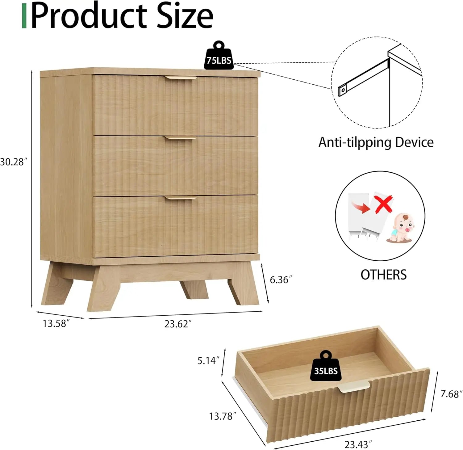 Fluted Nightstand 24" Mid Century Modern Night Stand 3 Storage Drawers
