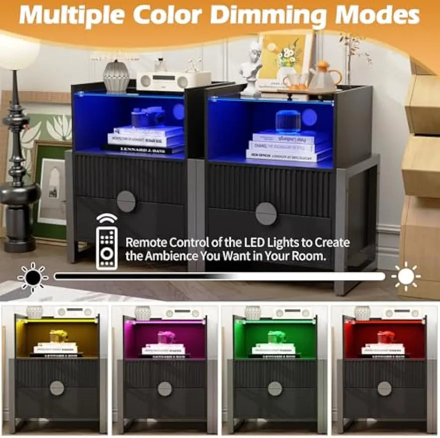 Fluted Nightstand with LED Lights Charging Station 2 Drawer Modern Table