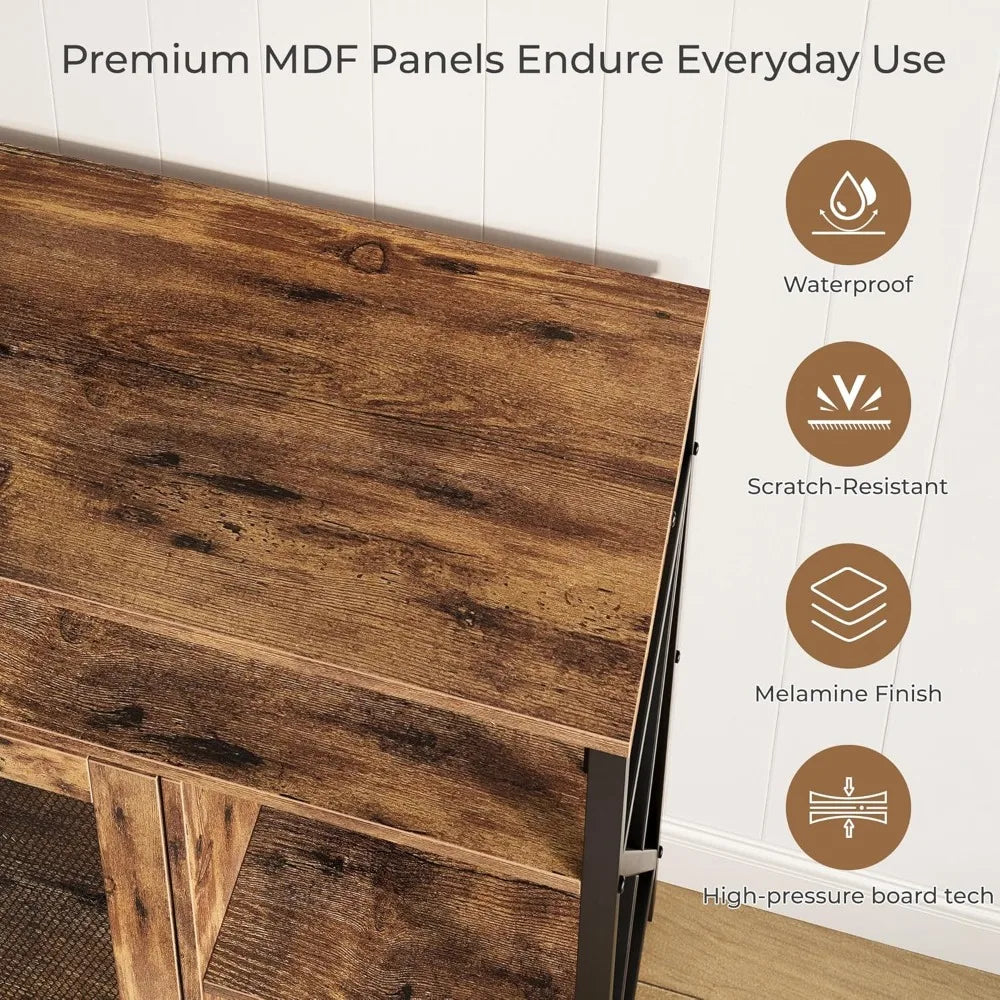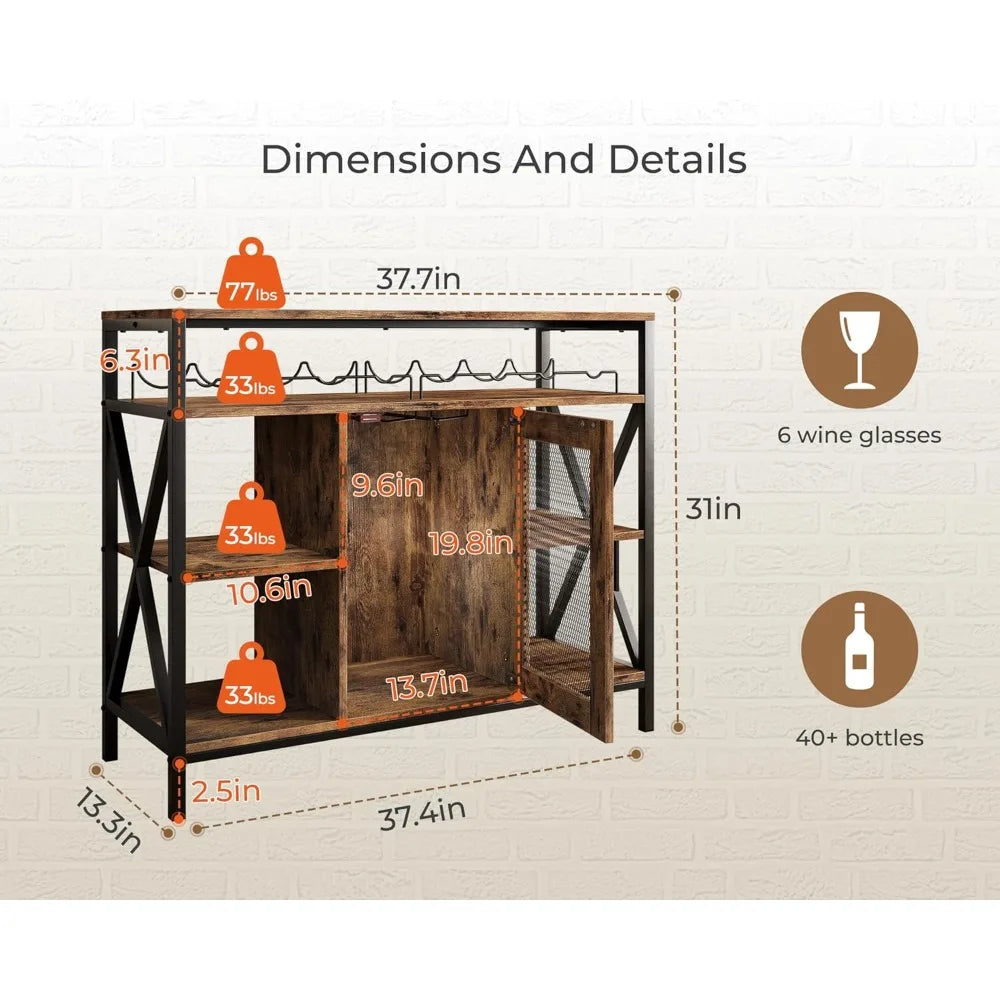 - Storage Options: 1 enclosed cabinet with double mesh doors, 4 open shelves, built-in wine rack, and glass holders
