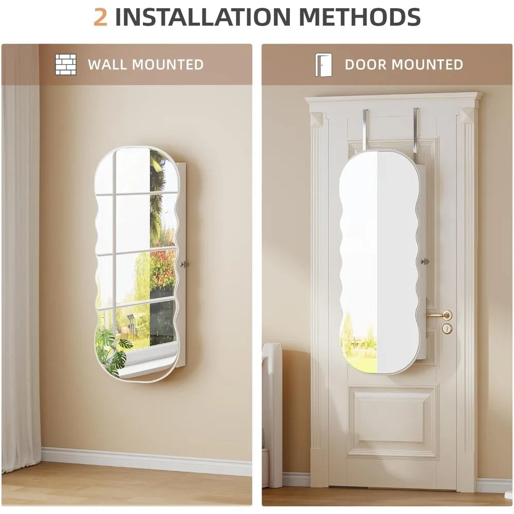 Introducing the Ljustra Jewelry Armoire, a perfect blend of style and practicality for your jewelry storage needs. With its elegant wavy mirror and integrated LED lights, this armoire is more than just a storage solution—it's a statement piece that enhances your space.