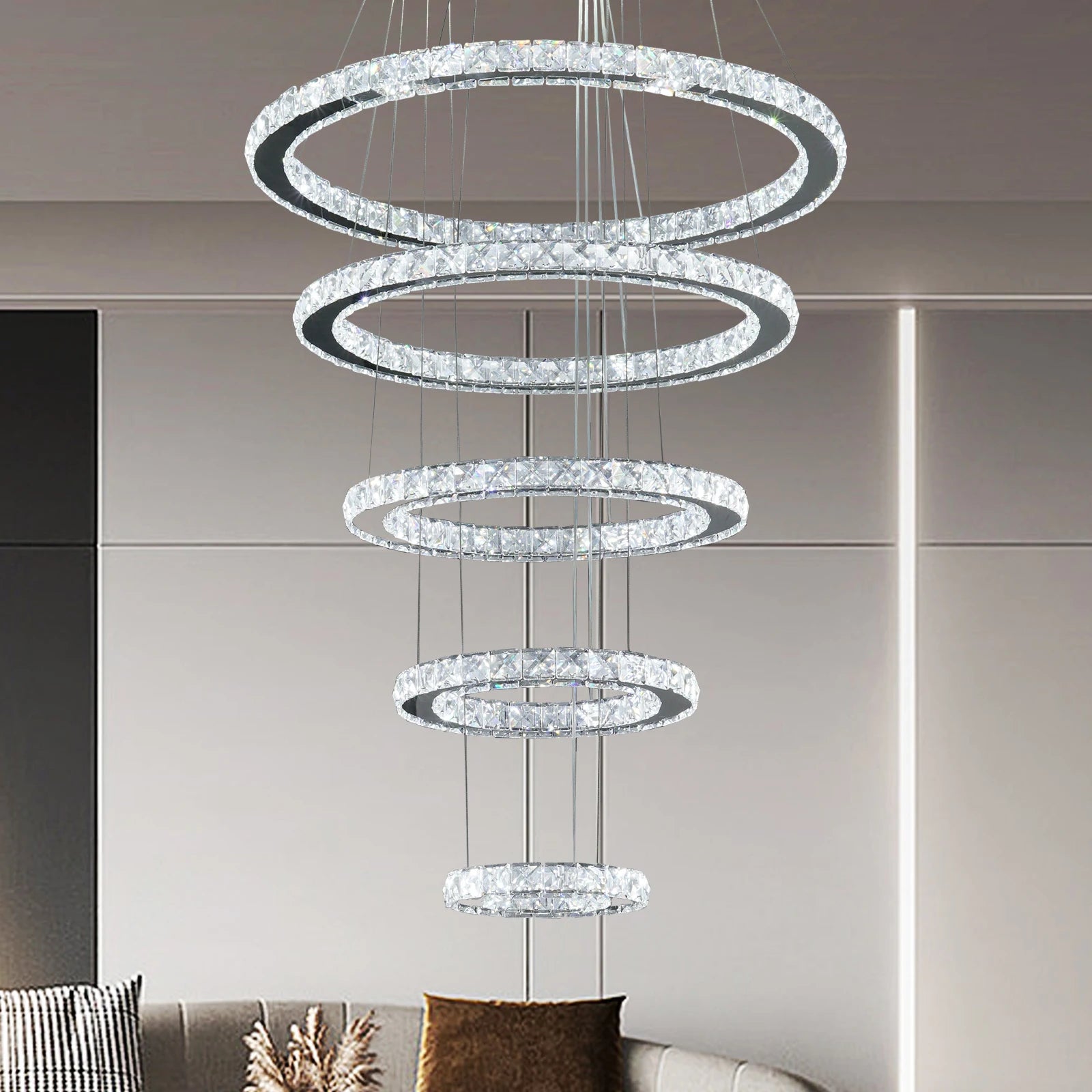 Transform your living area, dining room, or hotel lobby with the stunning K9 Crystal Ring LED Pendant Light. This modern chandelier is designed to captivate and provide an exquisite ambiance, making it the perfect statement piece for any indoor space.
