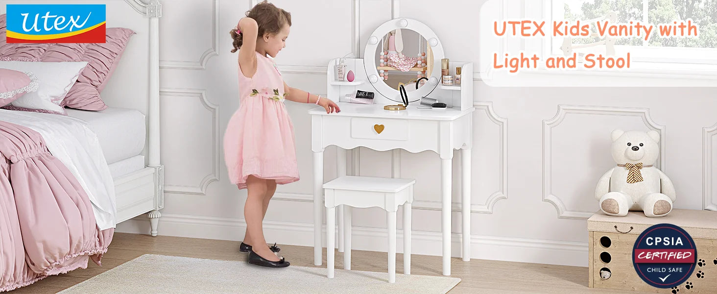 Kids Vanity Set with Mirror Stool Lights for Girls Pretend Play Furniture