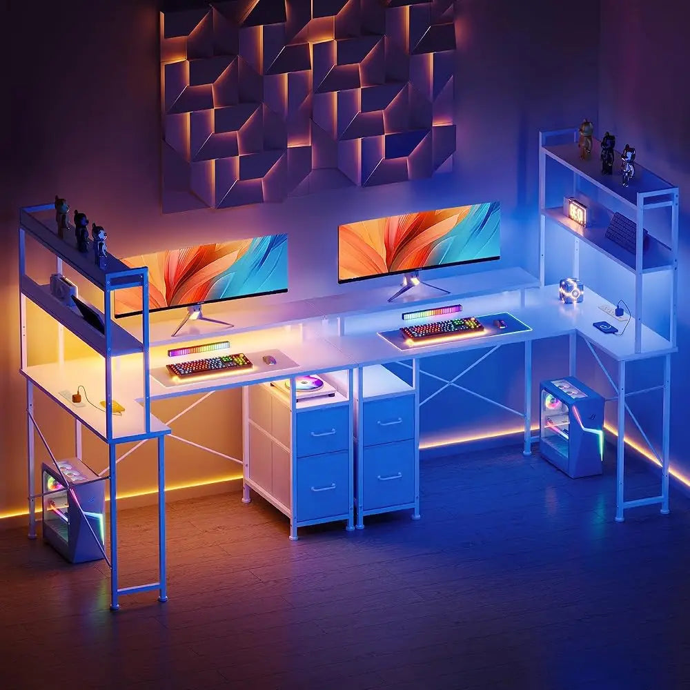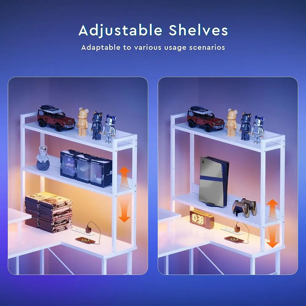 L Shaped Gaming Desk with Shelves LED Lights Charging Station Home Office