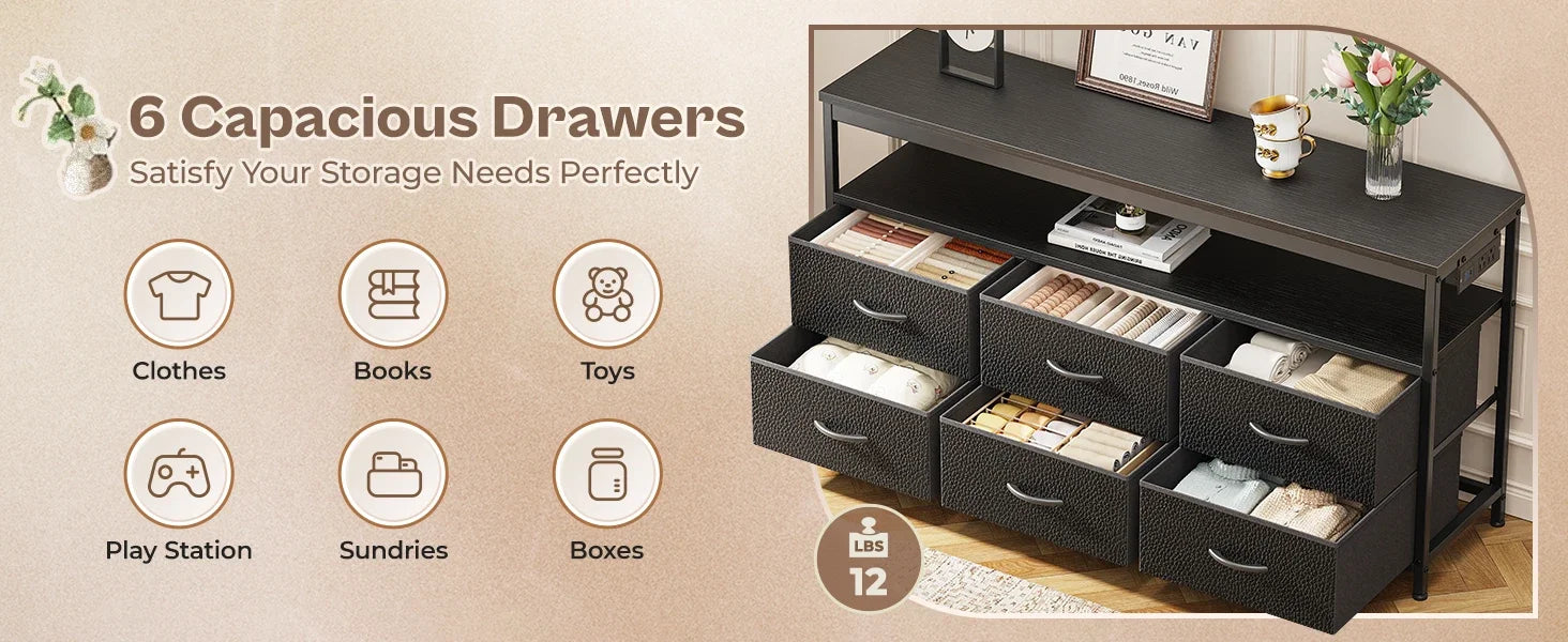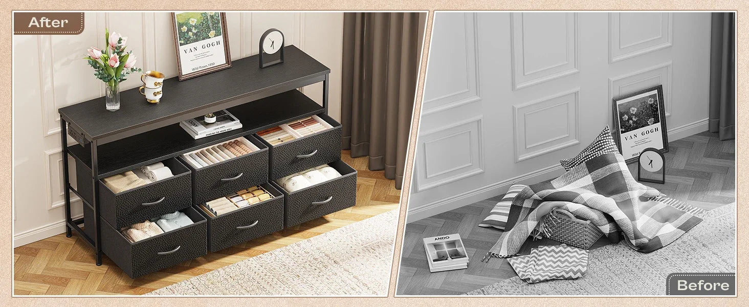 - Spacious Storage: Features 6 large fabric drawers and an open shelf for all your essentials.
