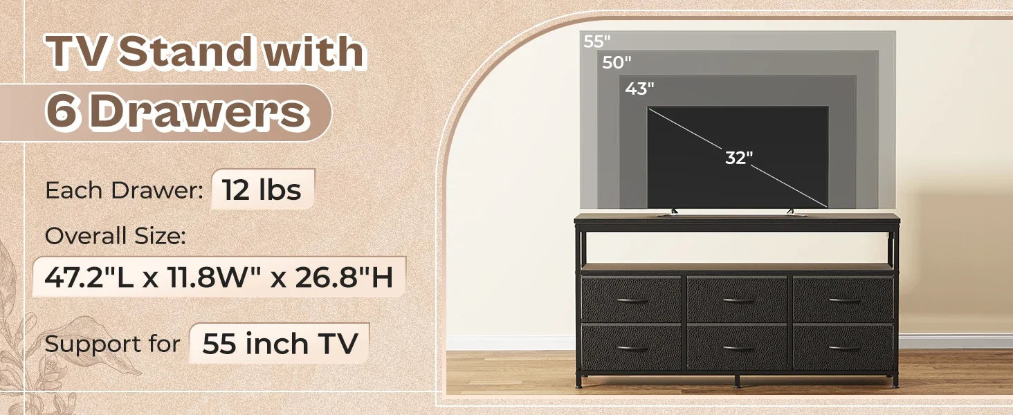 LED TV Stand 47 Inch Fabric Dresser with Power Outlets and 6 Drawers