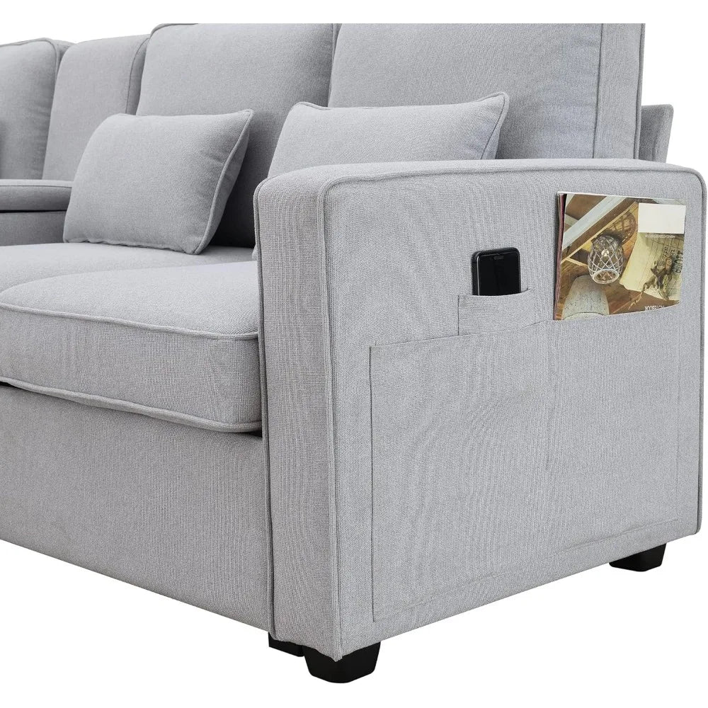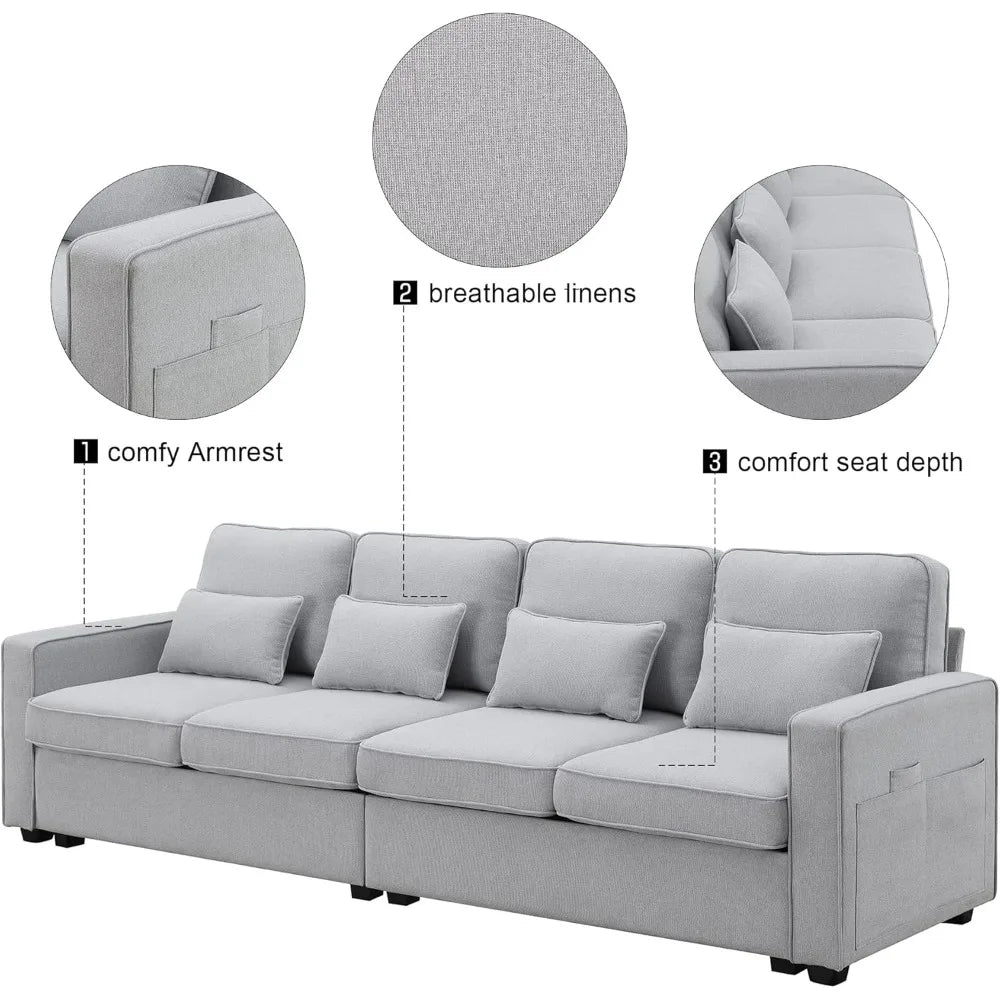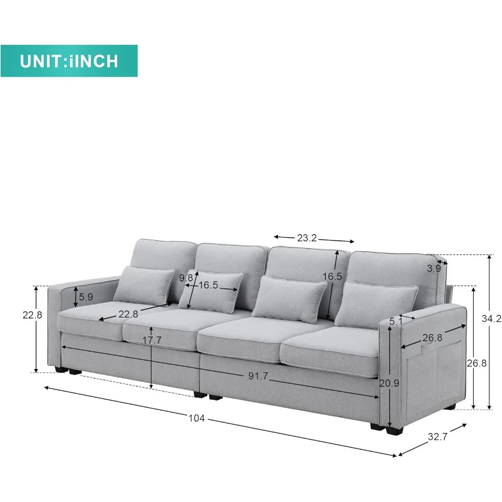 104" 4-Seater Linen Fabric Sofa Couch w/ Side Storage Pockets & Pillows – Modern Minimalist Design