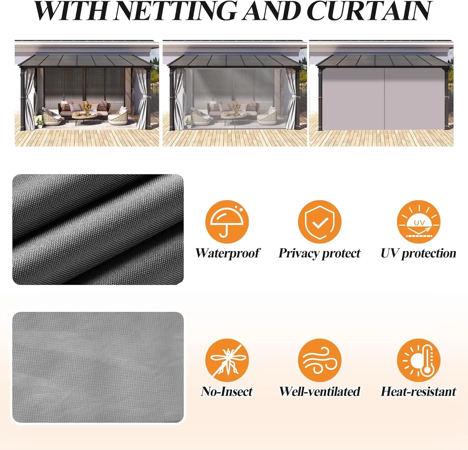 - Sturdy Aluminum Frame: Crafted with premium powder-coated aluminum, our gazebo is resistant to fading, rust, and corrosion, ensuring durability and strength.