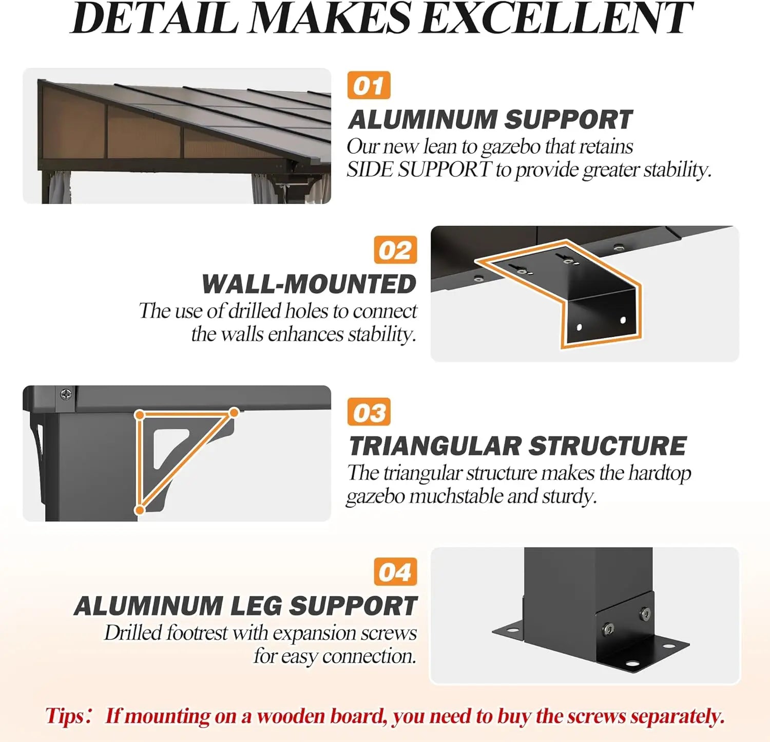 Elevate your outdoor experience with the Ljustra 10’ x 13’ Gazebo, designed for functionality and style. This stunning wall-mounted gazebo offers a perfect blend of elegance and practicality, making it ideal for patios, gardens, decks, and more.