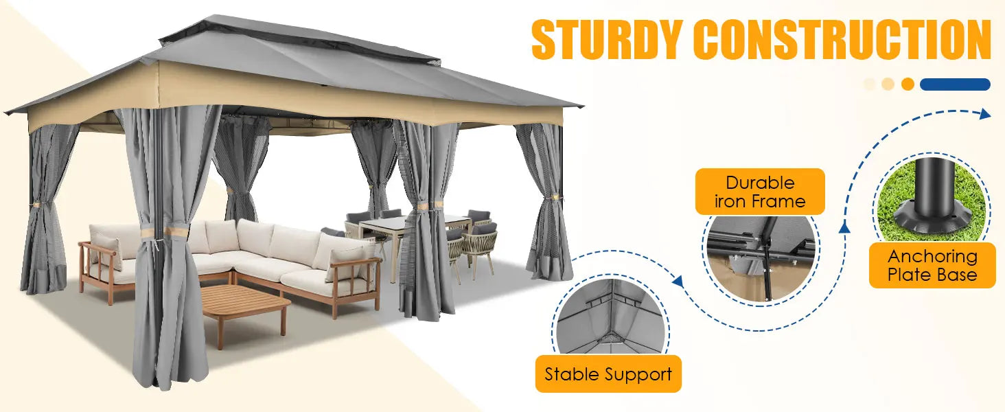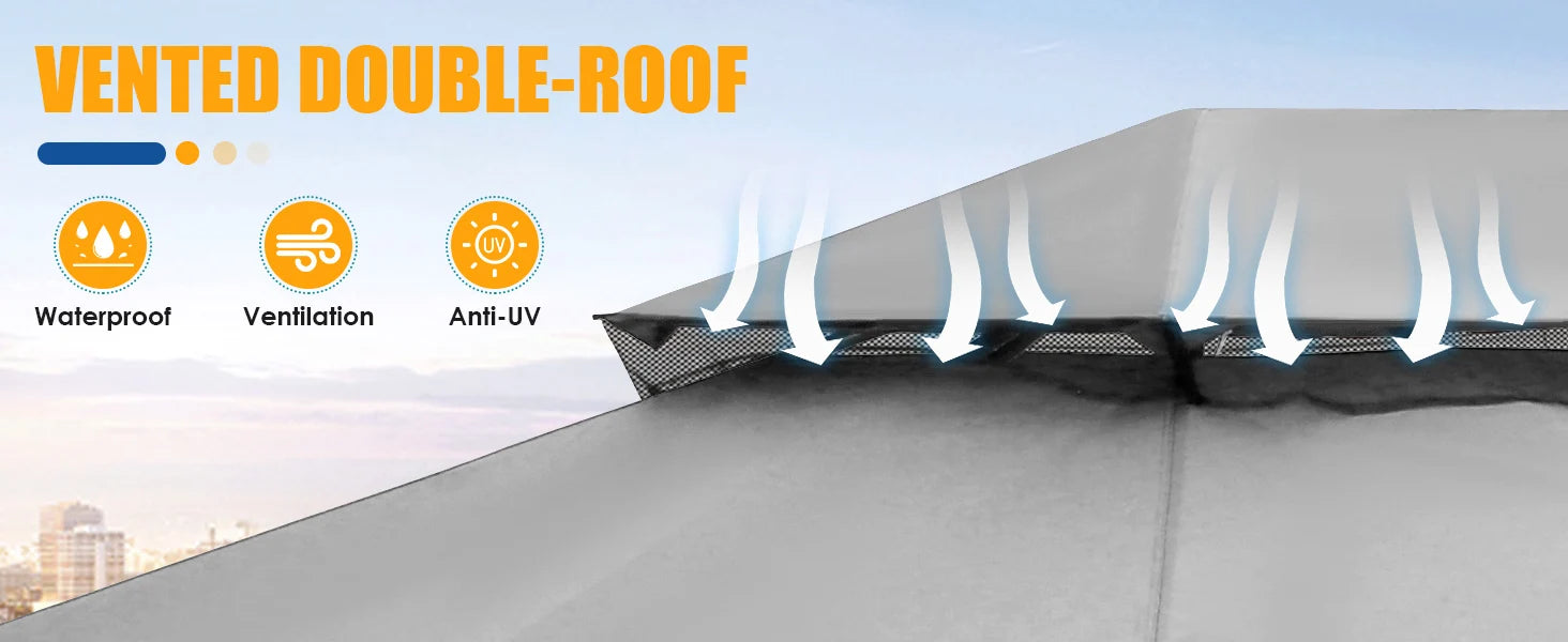 - Adjustable & Ventilated Double Roof Top: Crafted with an Oxford polyester top and PU coating, this gazebo offers superior UV protection and enhanced air circulation.