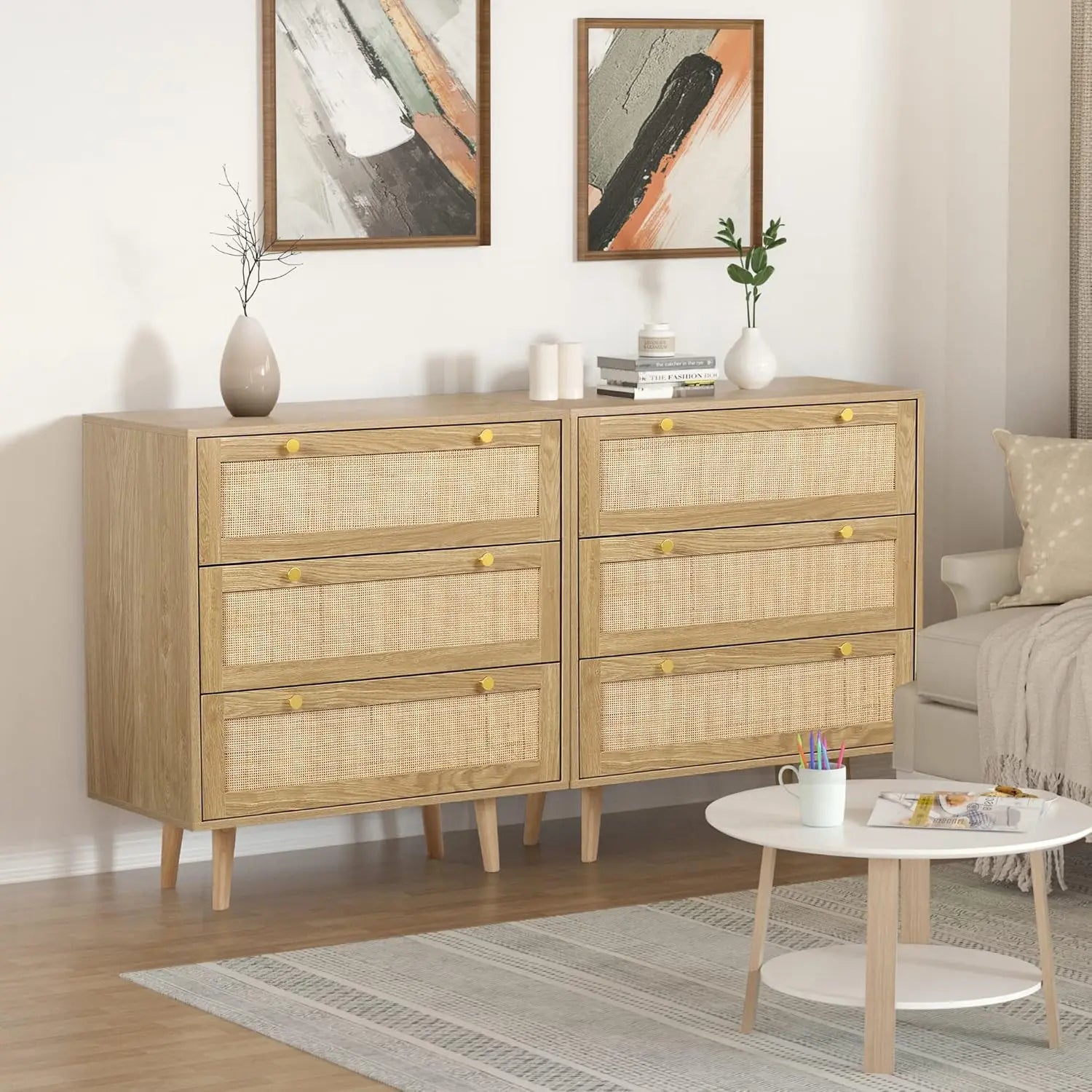 Transform your bedroom or hallway with the Ljustra 3 Drawer Dresser, a perfect blend of style and functionality. This modern wood chest of drawers, adorned with natural handmade rattan and elegant gold handles, adds a touch of sophistication to any room.