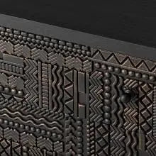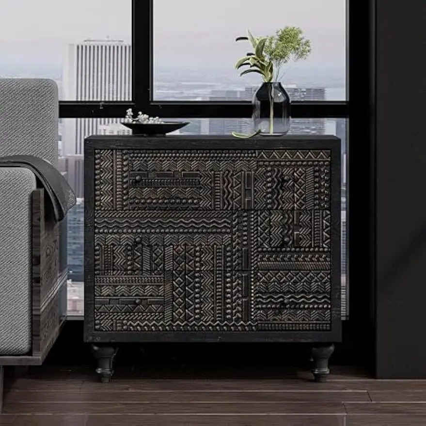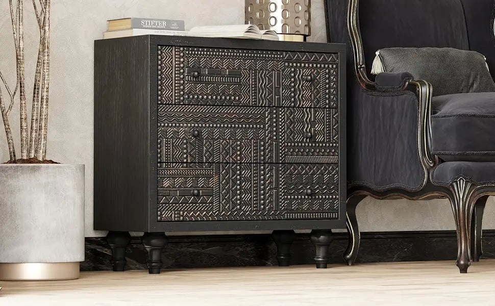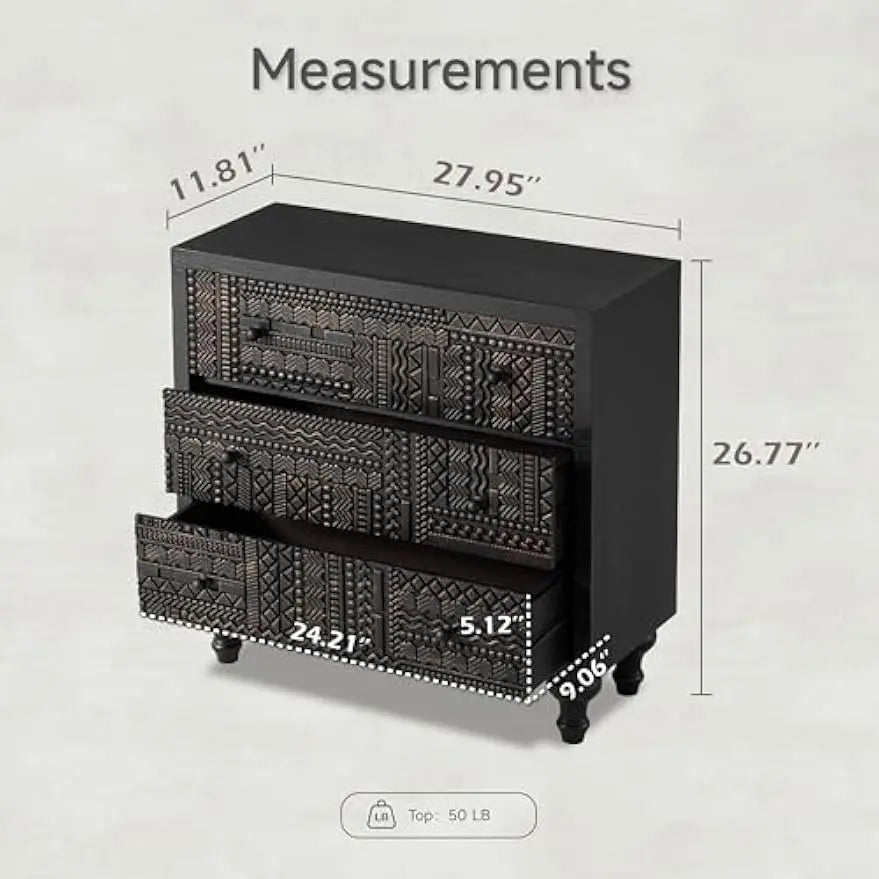3 Drawer Farmhouse Dresser Geometric Carved Pattern Vintage Accent Chest