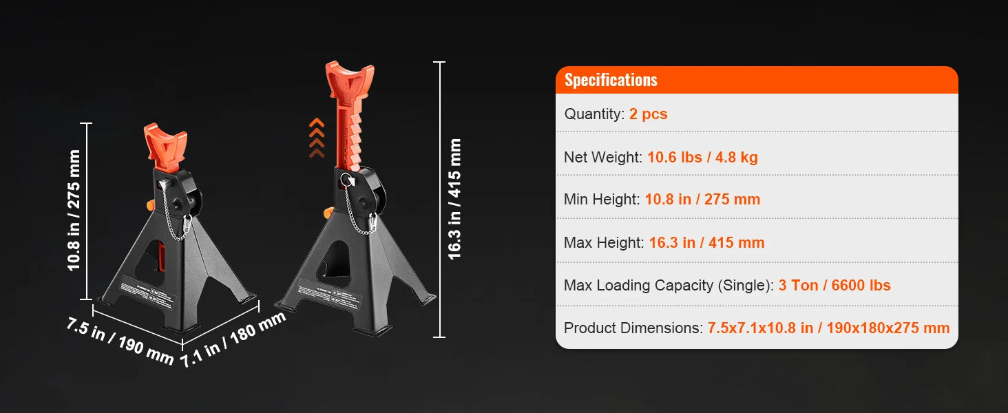 Are you ready to tackle your toughest vehicle lifting tasks? The Ljustra 3 Ton Car Jack Stands are here to provide you with the reliability and security you need. With a robust 3-ton (6600 lbs) capacity, these jack stands are perfect for SUVs, pickups, cars, UTVs, and ATVs.
