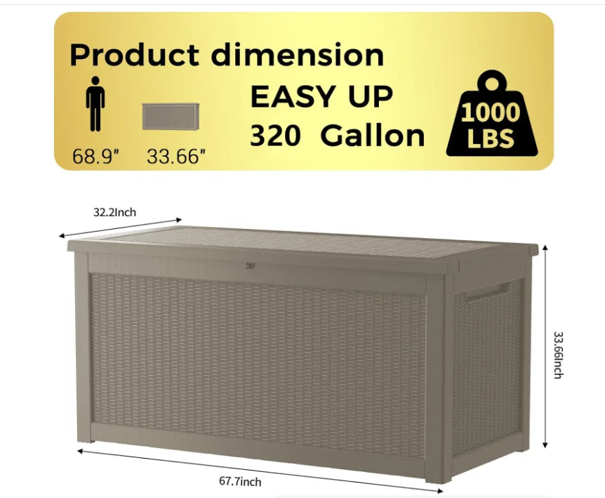 - Spacious Design: With dimensions of 67.72 in. L x 32.2 in. W x 33.66 in. H, this storage box offers an impressive capacity of 320 gallons, perfect for cushions, garden tools, and more.