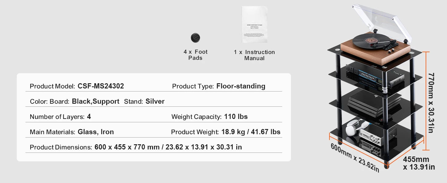 - Customizable Storage: Adjustable shelf heights allow for tailored storage solutions for all your AV devices.