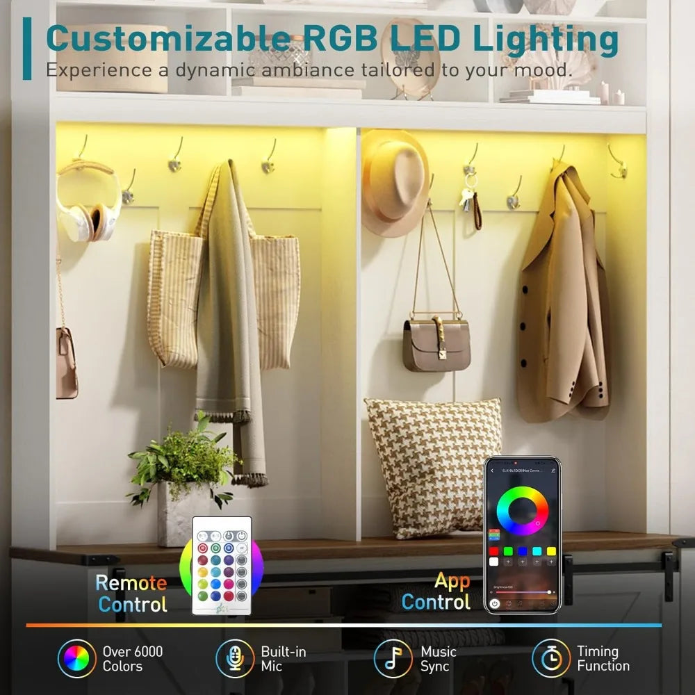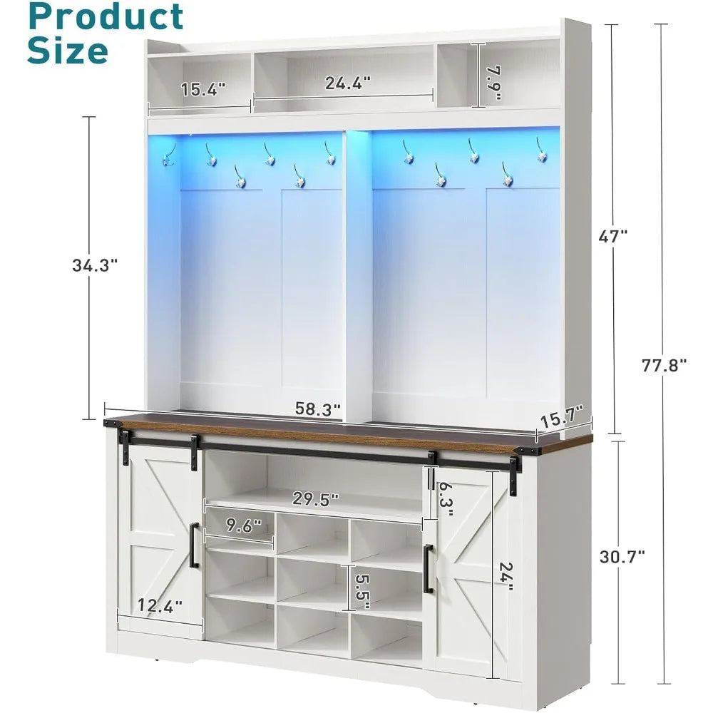 Farmhouse 58-Inch Entryway Hall Tree with LED Lighting Storage Bench
