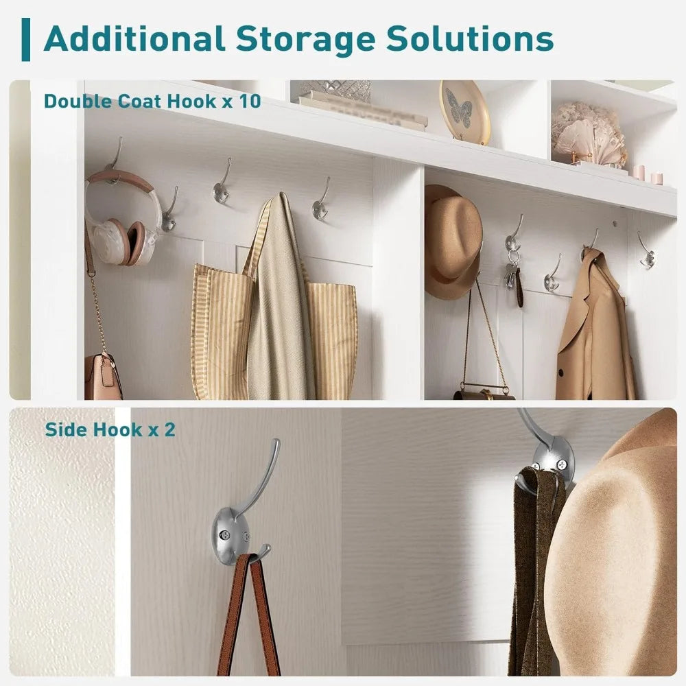 - Spacious Entryway Organizer: Dimensions of 58.3"L x 15.7"W x 77.8"H provide ample space with a 9-slot shoe rack, 12 coat hooks, an open shelf, and two cabinets with adjustable shelves.