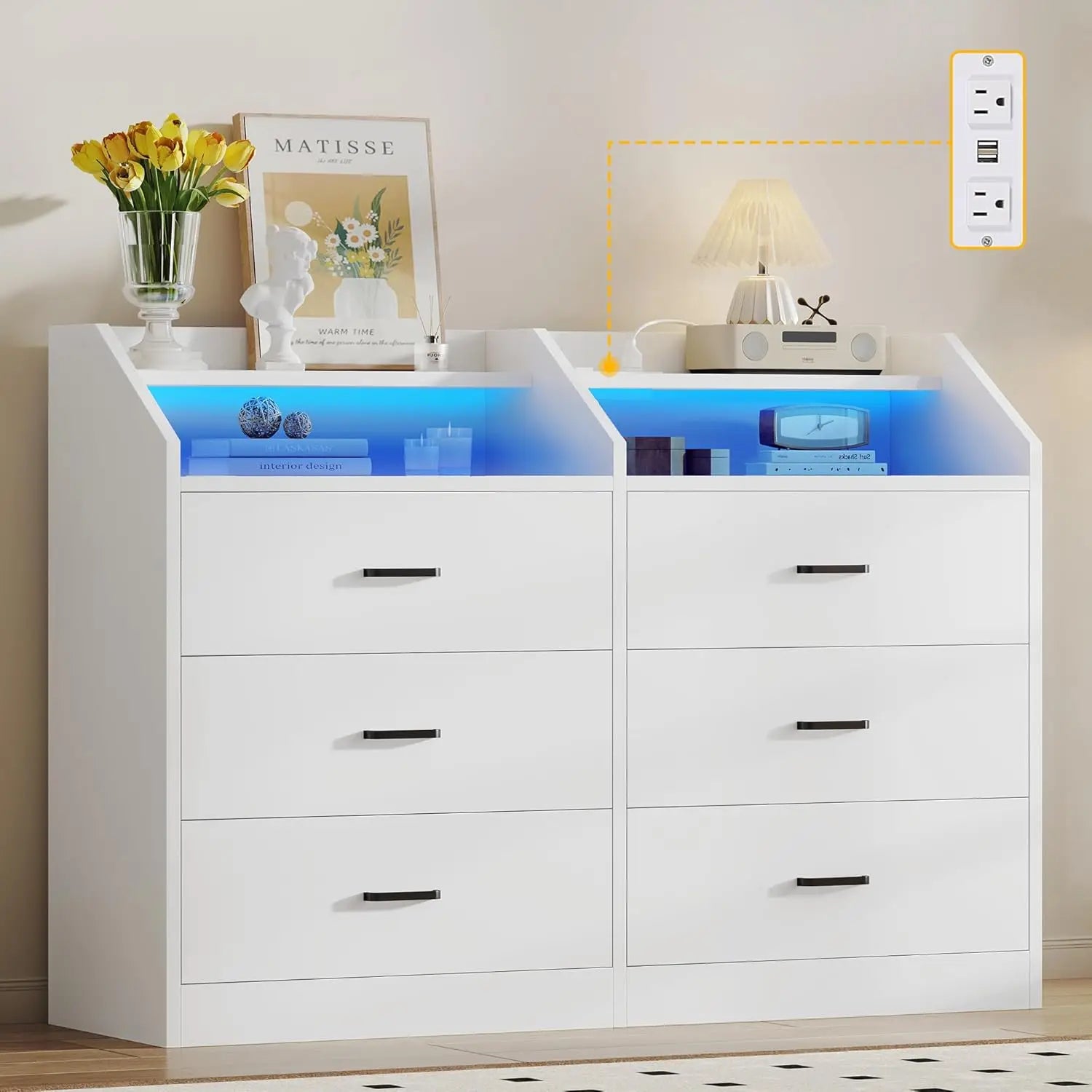 6 Drawer Dresser LED Light Charging Station Modern Storage Cabinet