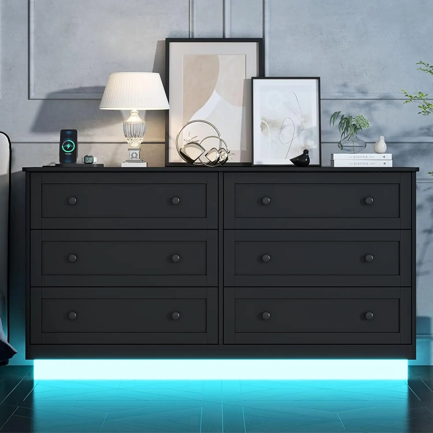 Limited Time Offer 6 Drawer Dresser Modern Chest with Power Outlet LED Light