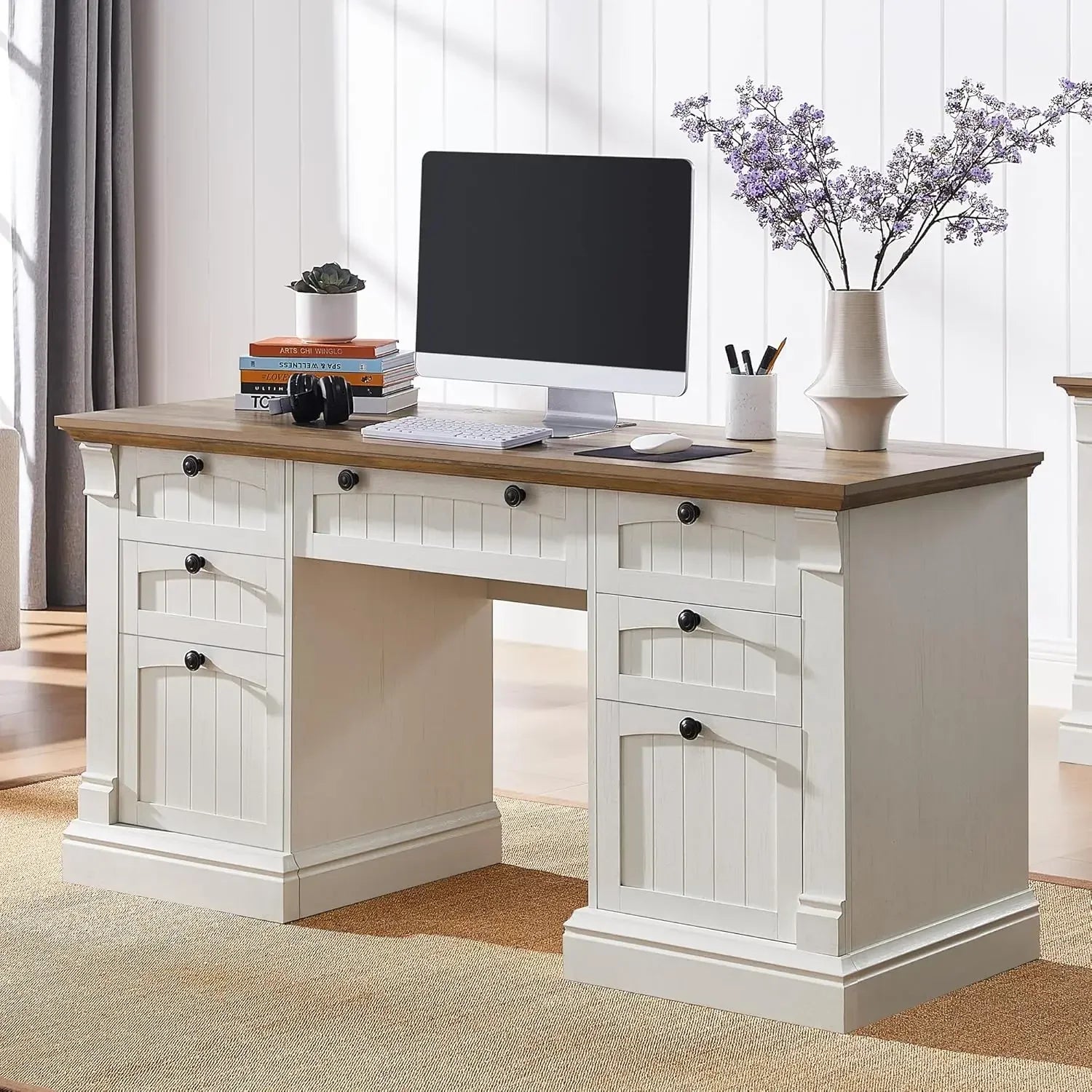 With its antique white finish and rustic wood top, the Ljustra 60" Executive Desk not only enhances your workspace but also complements various décor styles, making it a versatile addition to any room.