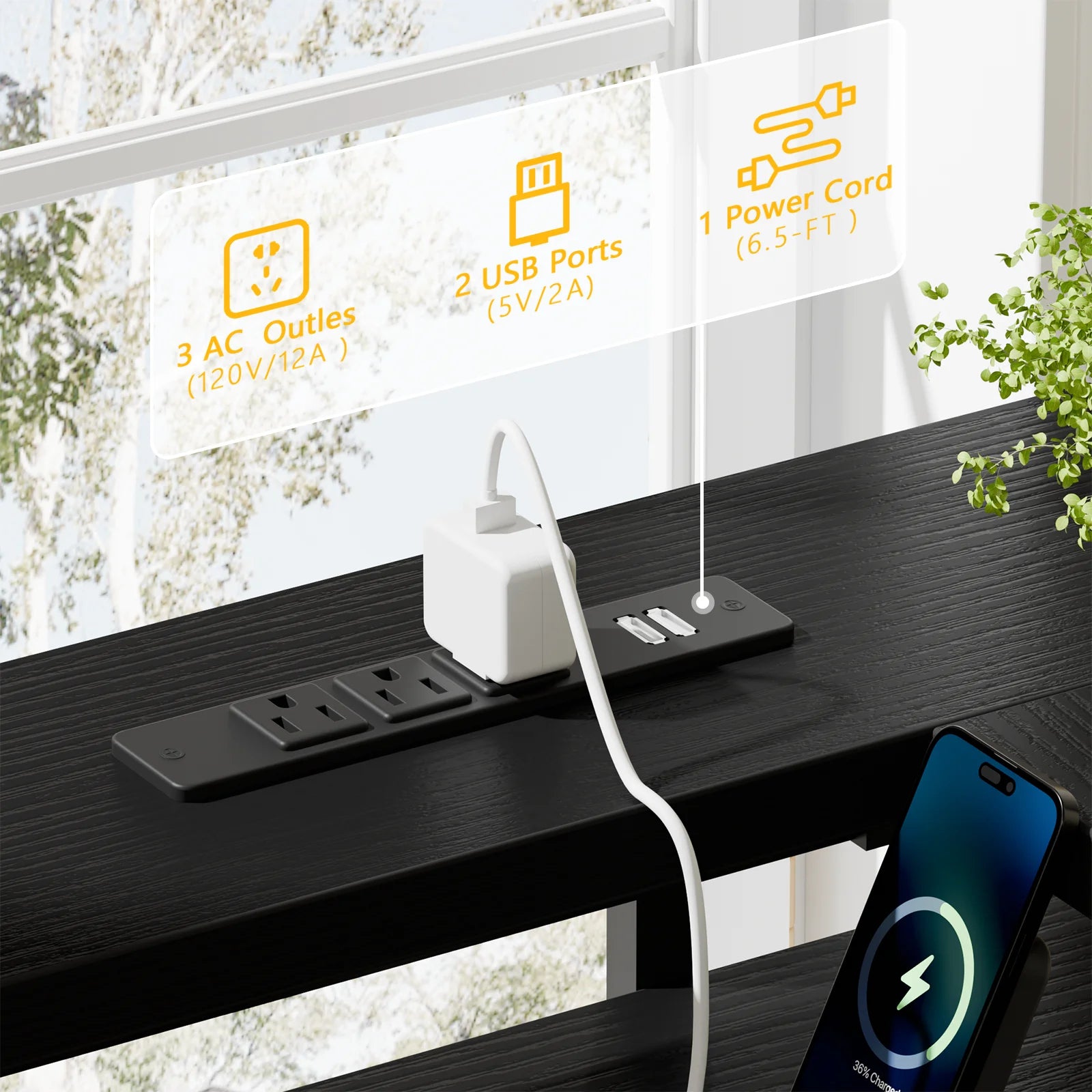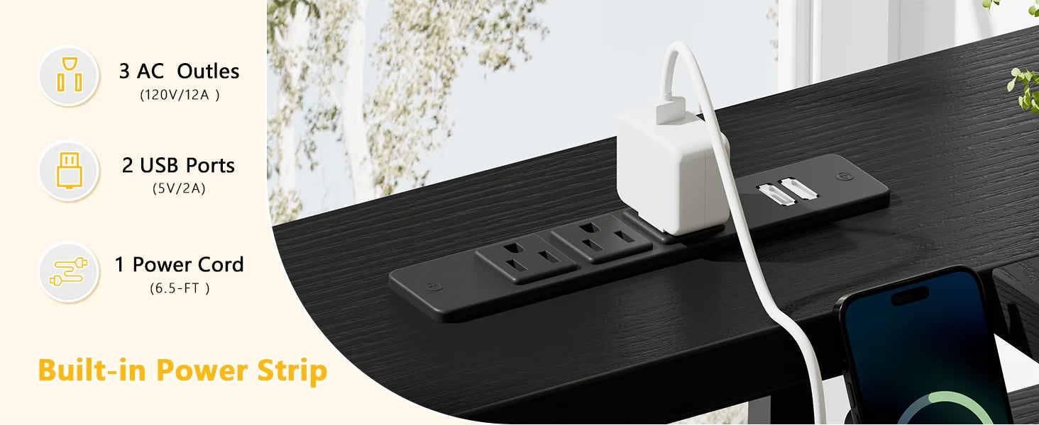 - Power Features: 3 Power Outlets and 2 USB Ports