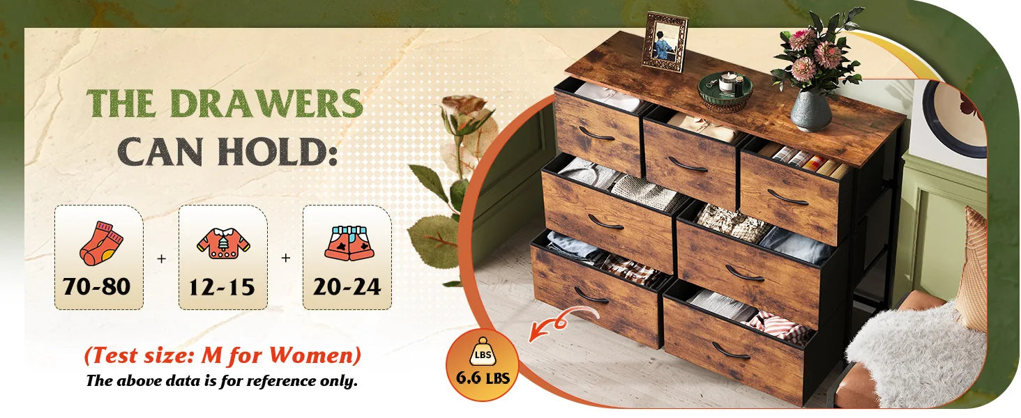 - Roomy Storage Space: Features 7 foldable deep drawers for endless organizational possibilities while maintaining your privacy. The wooden top is ideal for displaying vases, photos, and mirrors.