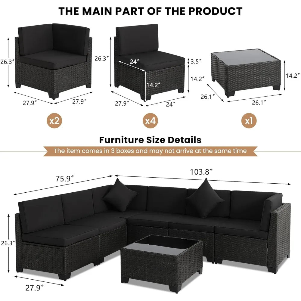 - Classic Wicker Patio Set: This 7-piece outdoor sectional includes 6 sofas with plush cushions and a stylish tempered glass-top coffee table, ideal for your patio, garden, or poolside.