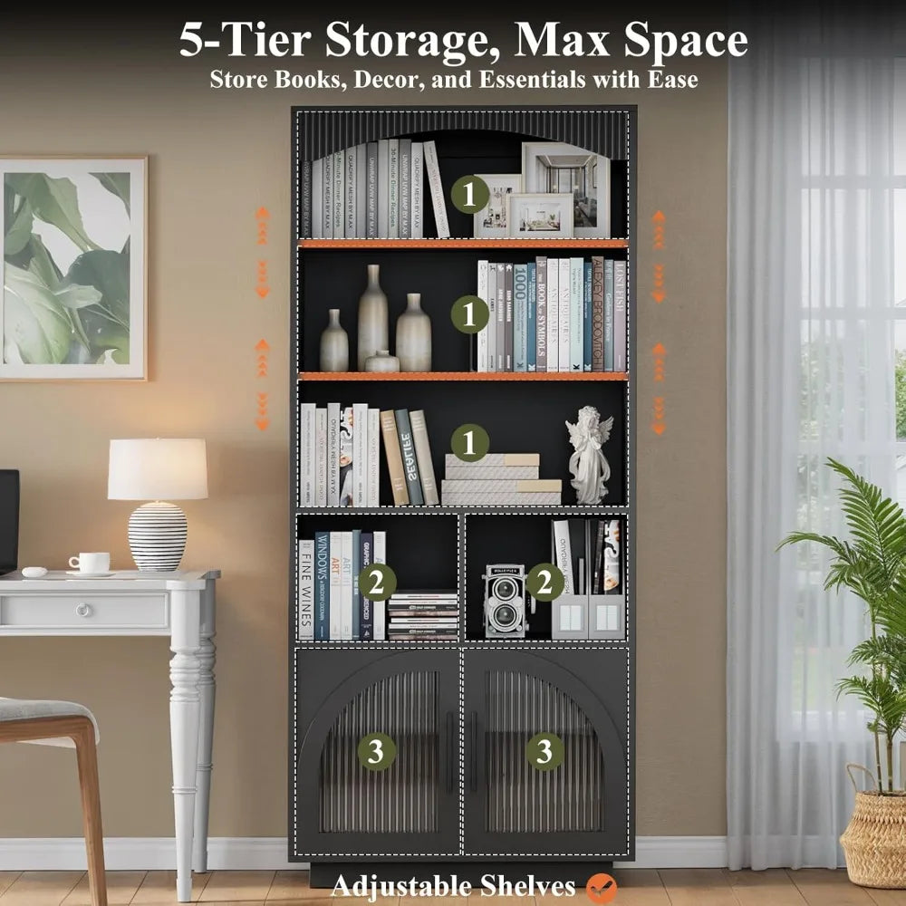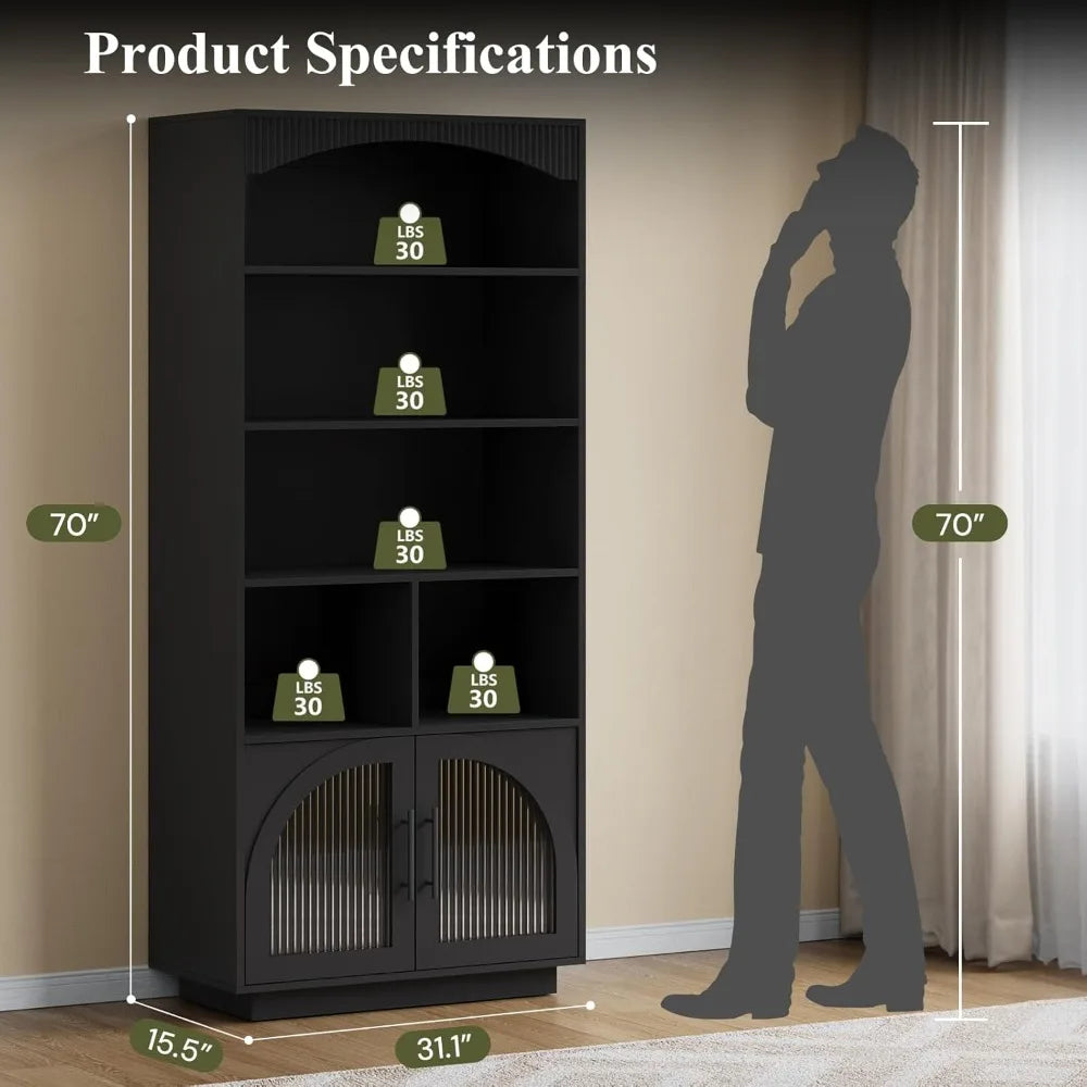 70 Inch Tall Black Bookshelf with Glass Doors Mid Century Modern Storage