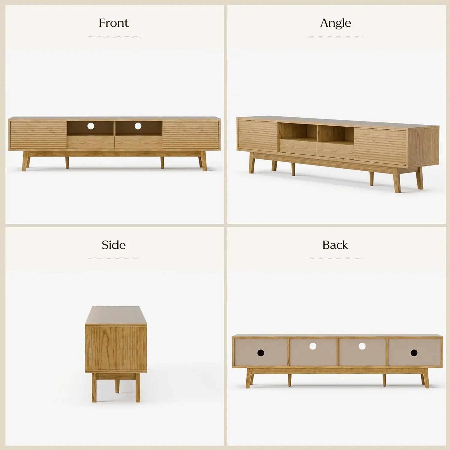 Elevate your home entertainment experience with our stunning Mid Century Modern TV Console. Designed to blend seamlessly into any decor, this low-profile media stand is perfect for televisions ranging from 55 to 75 inches. The elegant fluted sliding doors not only enhance its aesthetic appeal but also provide a stylish storage solution.