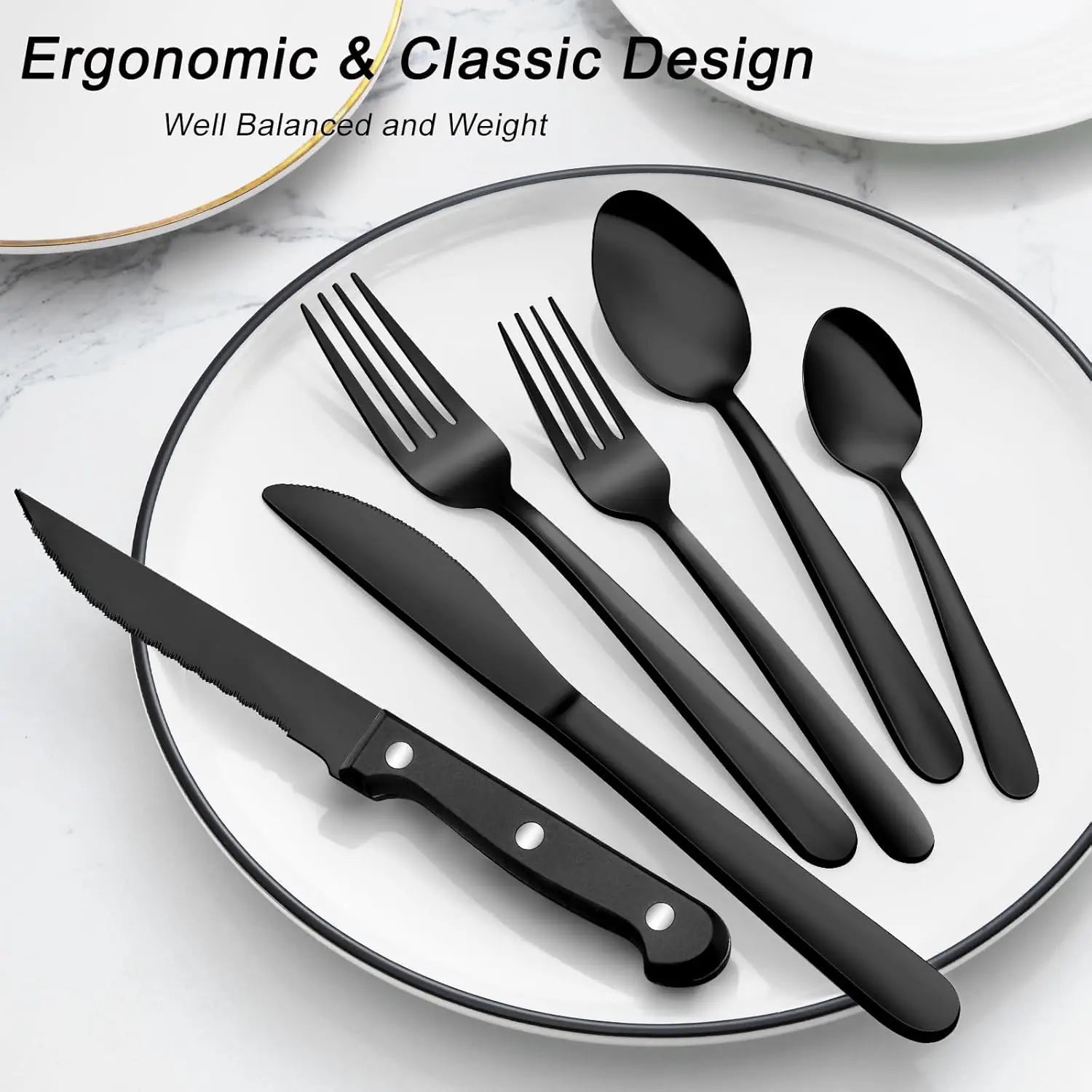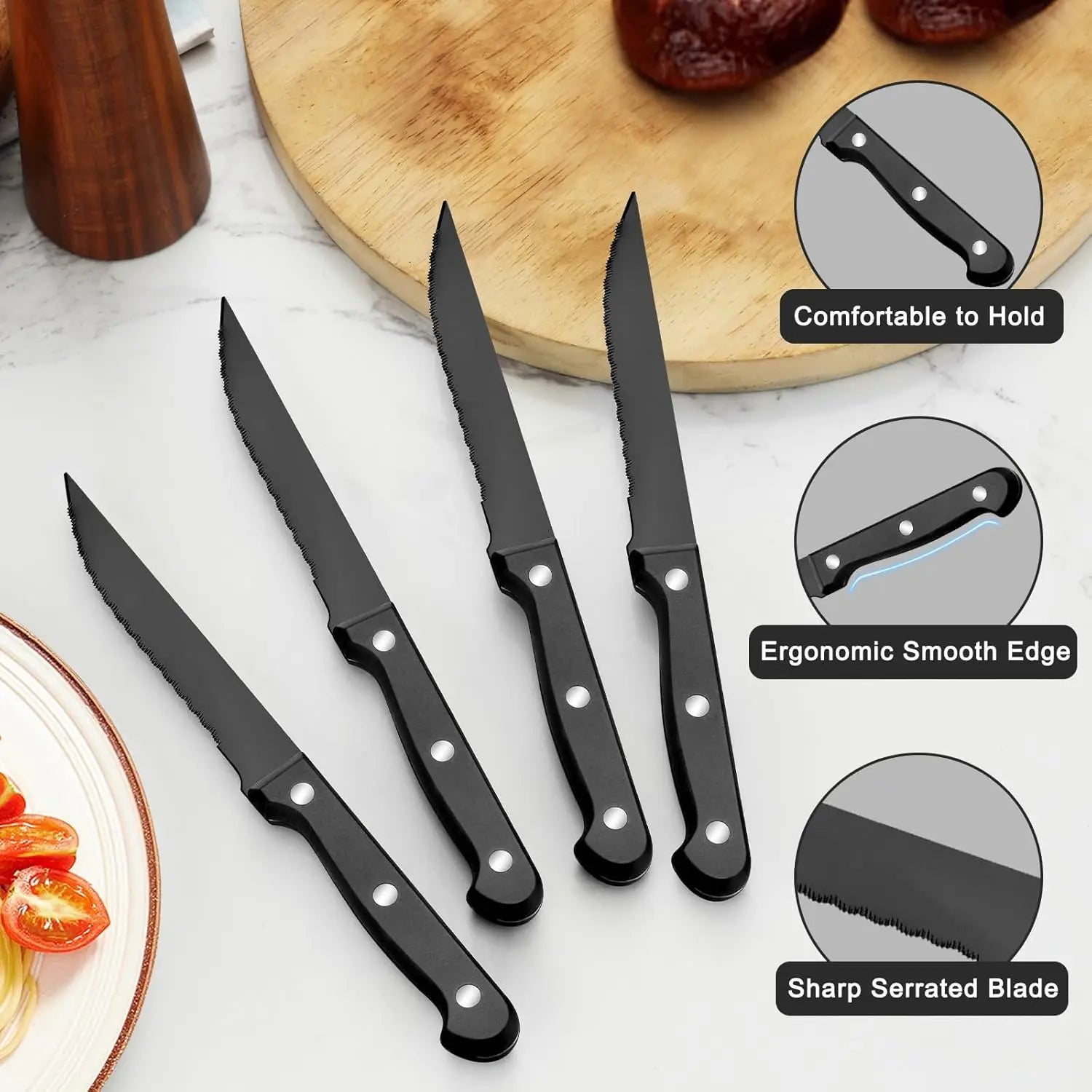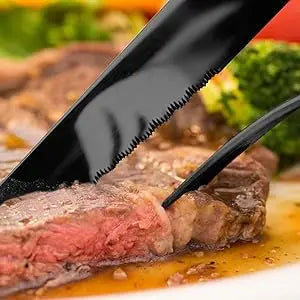 - Includes sharp serrated steak knives, perfect for cutting meats effortlessly.