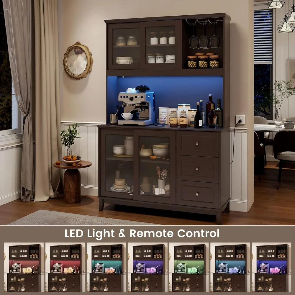 - Built-in Charging Station: Equipped with 2 USB ports, 1 Type-C, and 2 AC outlets, this pantry hutch ensures your devices are always charged and ready.