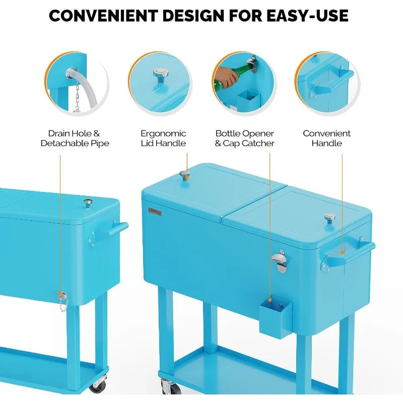 Elevate your next gathering with the Ljustra 80 Quart Rolling Ice Chest, a perfect blend of functionality and style. This portable cooler cart is designed to keep your beverages chilled and your guests happy!
