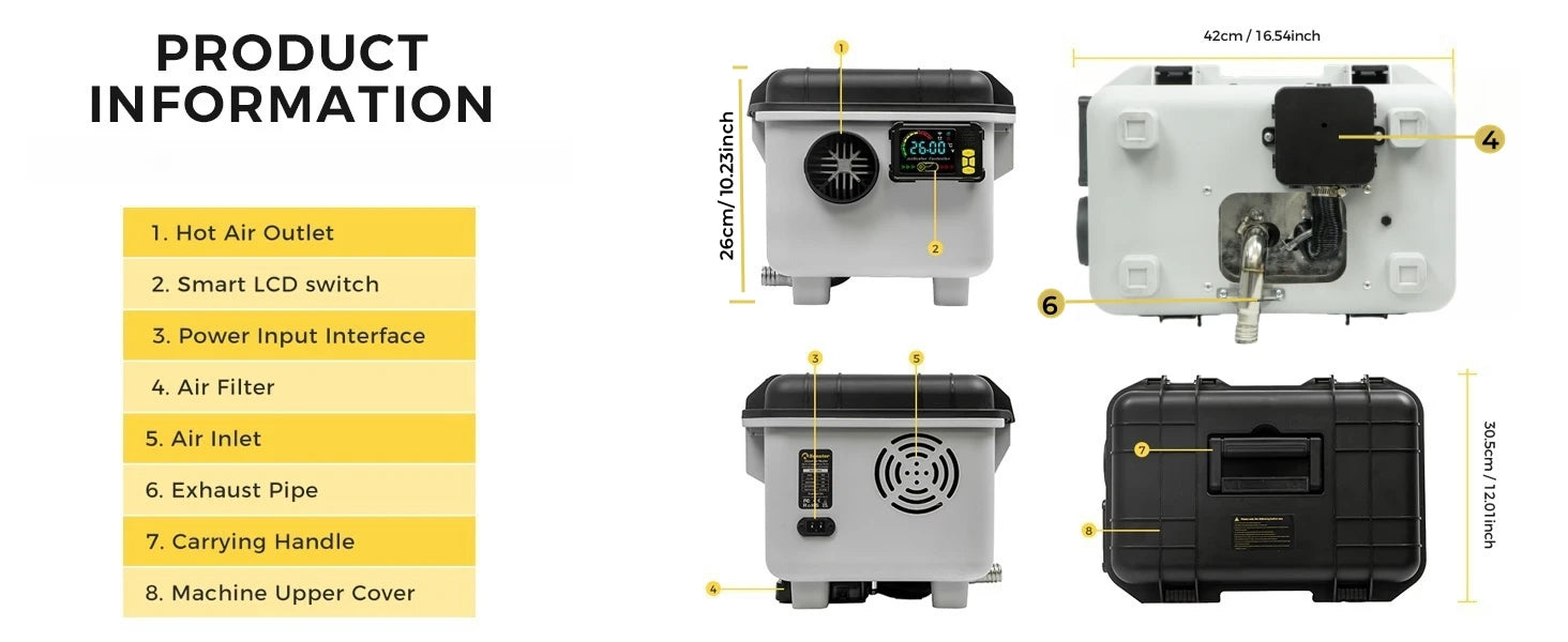 - Efficient Fuel Consumption: Uses only 0.16-0.45 L/H of diesel, providing long-lasting warmth.