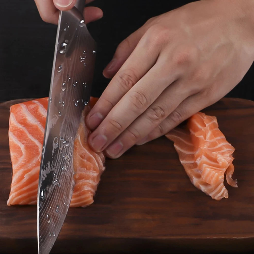 Elevate your culinary skills with the Ljustra 8PCS Kitchen Knife Set, designed for both home chefs and professional kitchens. This stunning set features a unique laser Damascus pattern and razor-sharp blades that guarantee precision and ease in every cut.