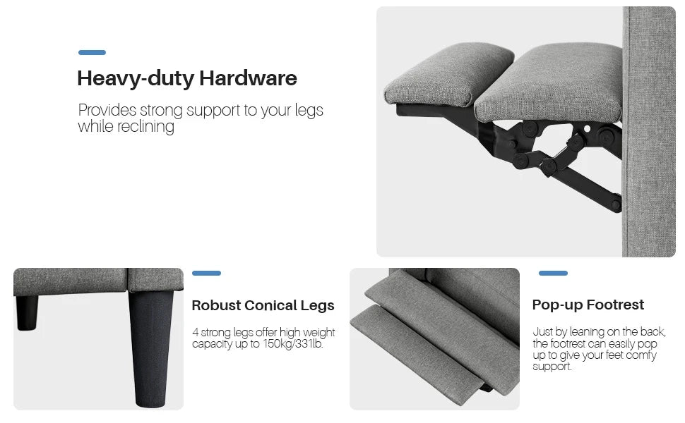 Experience Comfort and Style with our Mid-Century Modern Recliner Chair. This beautifully designed chair not only enhances your living room aesthetic but also provides ultimate relaxation. Perfect for unwinding after a long day, it features an adjustable reclining back and a convenient pop-up footrest.