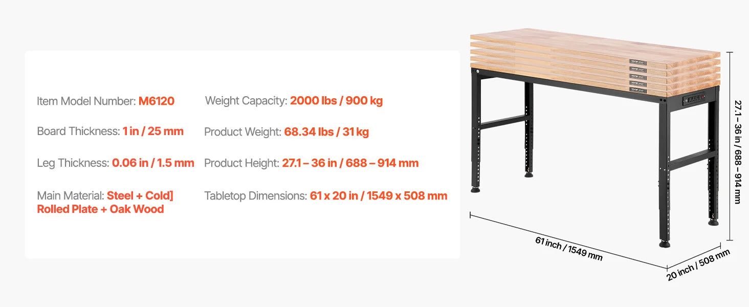 - Versatile Workspace: The 1.2" thick solid hardwood surface measuring 61" x 20" is perfect for a variety of tasks, from woodworking to crafting.